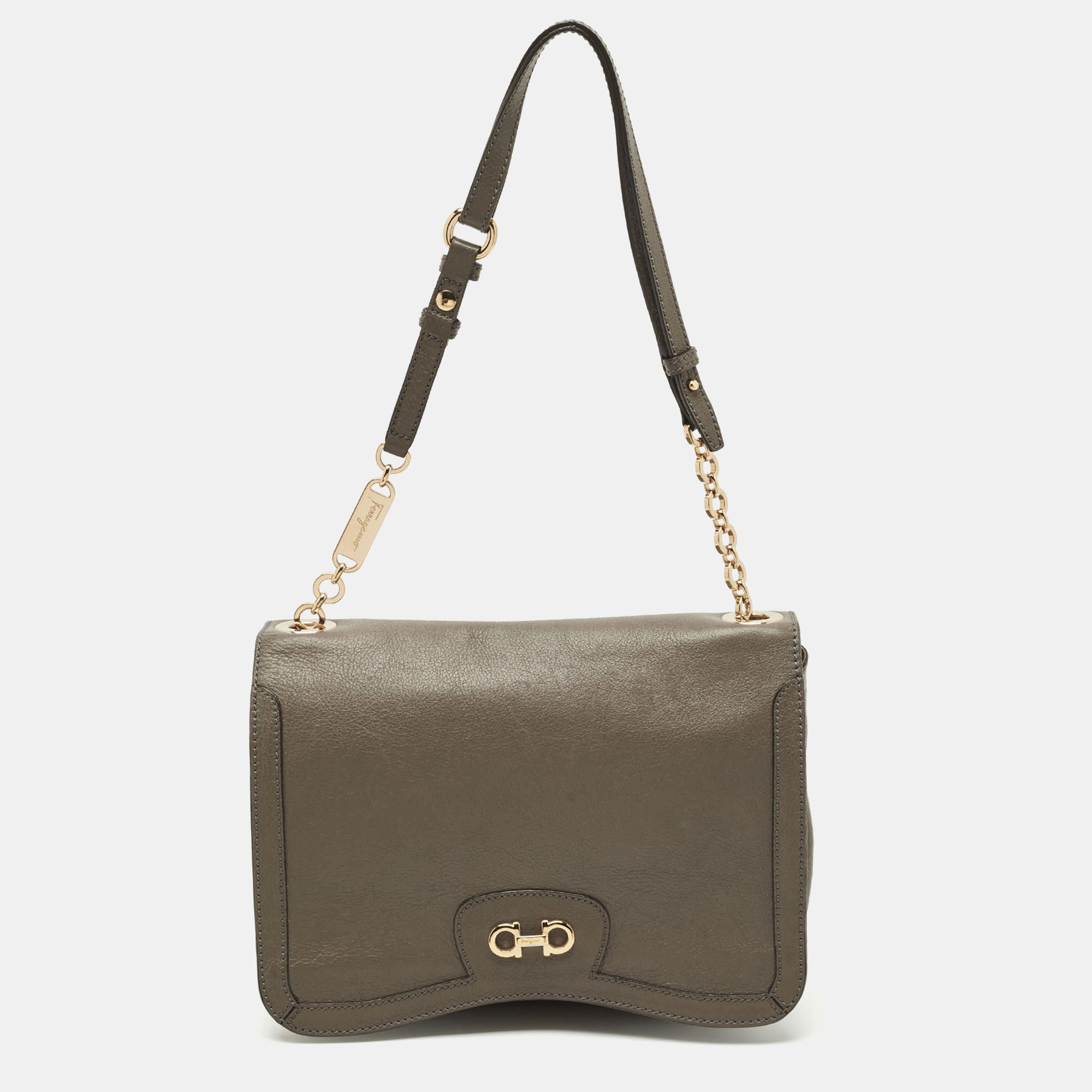 Salvatore Ferragamo’s dark beige leather shoulder bag is the epitome of understated luxury. The classic flap design is accented by the house’s iconic Gancini clasp, showcasing precision and timeless elegance.