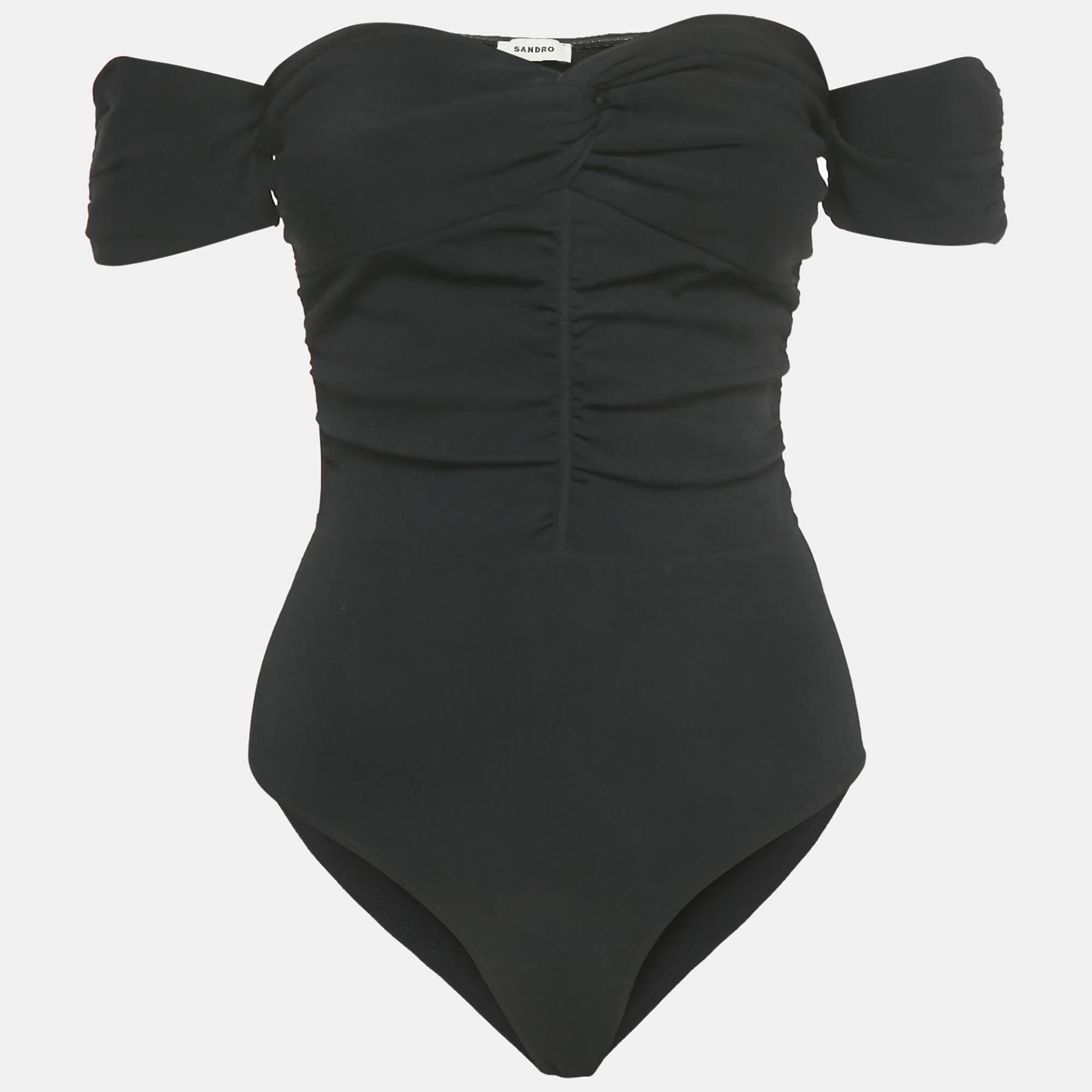 This Sandro top redefines everyday elegance with subtle Parisian allure. Designed in soft jersey with ruched detailing, it sits gracefully off the shoulders, creating a flattering neckline. Perfect for pairing with high waisted skirts or trousers, it captures chic effortlessness in a modern silhouette.