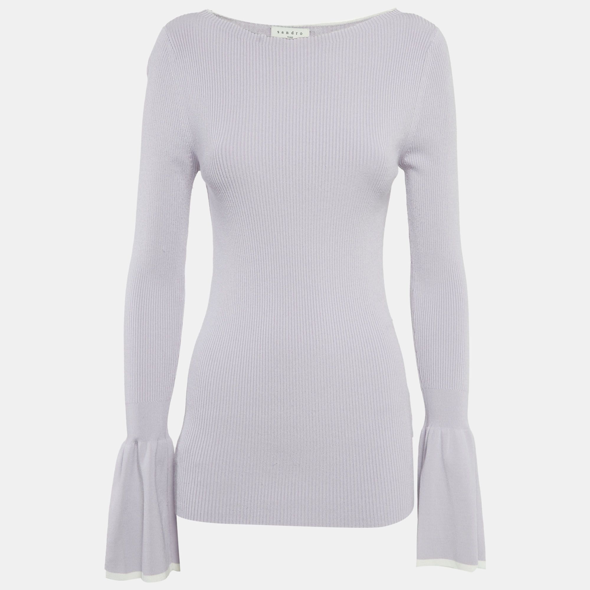 This Sandro rib knit top comes in a soft light purple tone, shaped with a close fit through the body. The gentle bell sleeves add movement. It’s a great choice for days when you want something simple with a delicate finish.