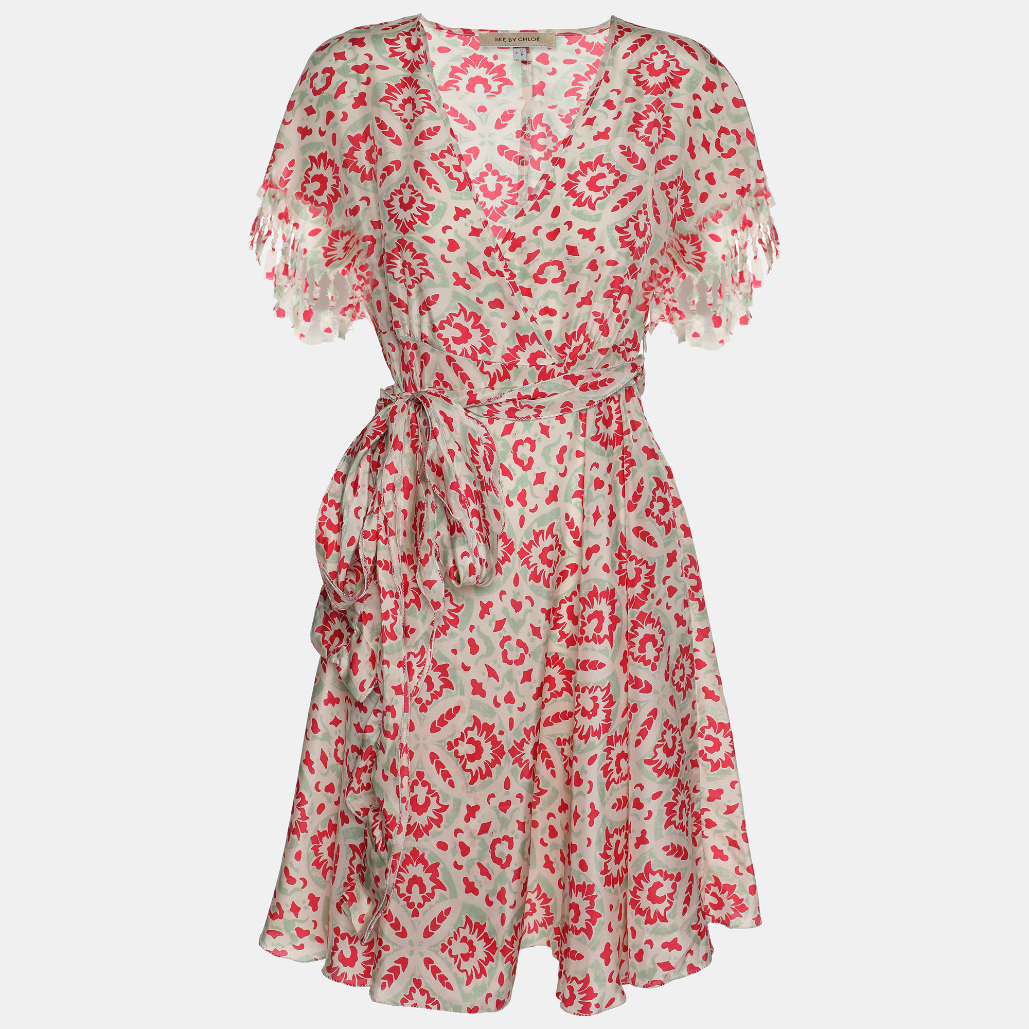 This Sandro wrap dress is crafted in orange satin and features heart print detailing. Designed to drape fluidly, it suits daytime occasions or evening styling with minimal accessories. A feminine dress that balances softness, color, and expressive print.
