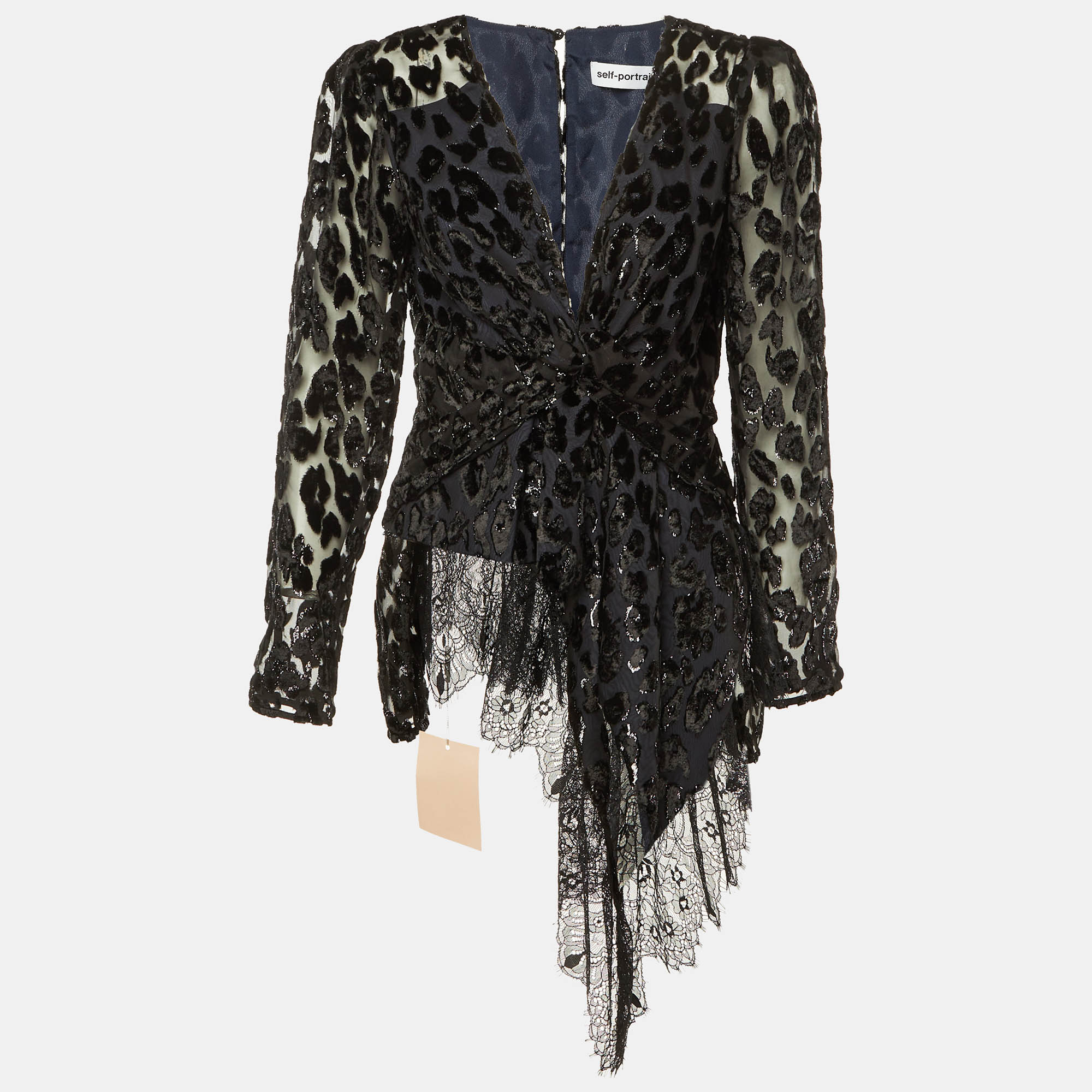 Self Portrait’s black Lurex devoré top lets shadows of leopard pattern shimmer over sheer fabric, while the twisted peplum moves with every step. Lace edges trace the asymmetrical hem, and a deep V neckline enhances the overall design.