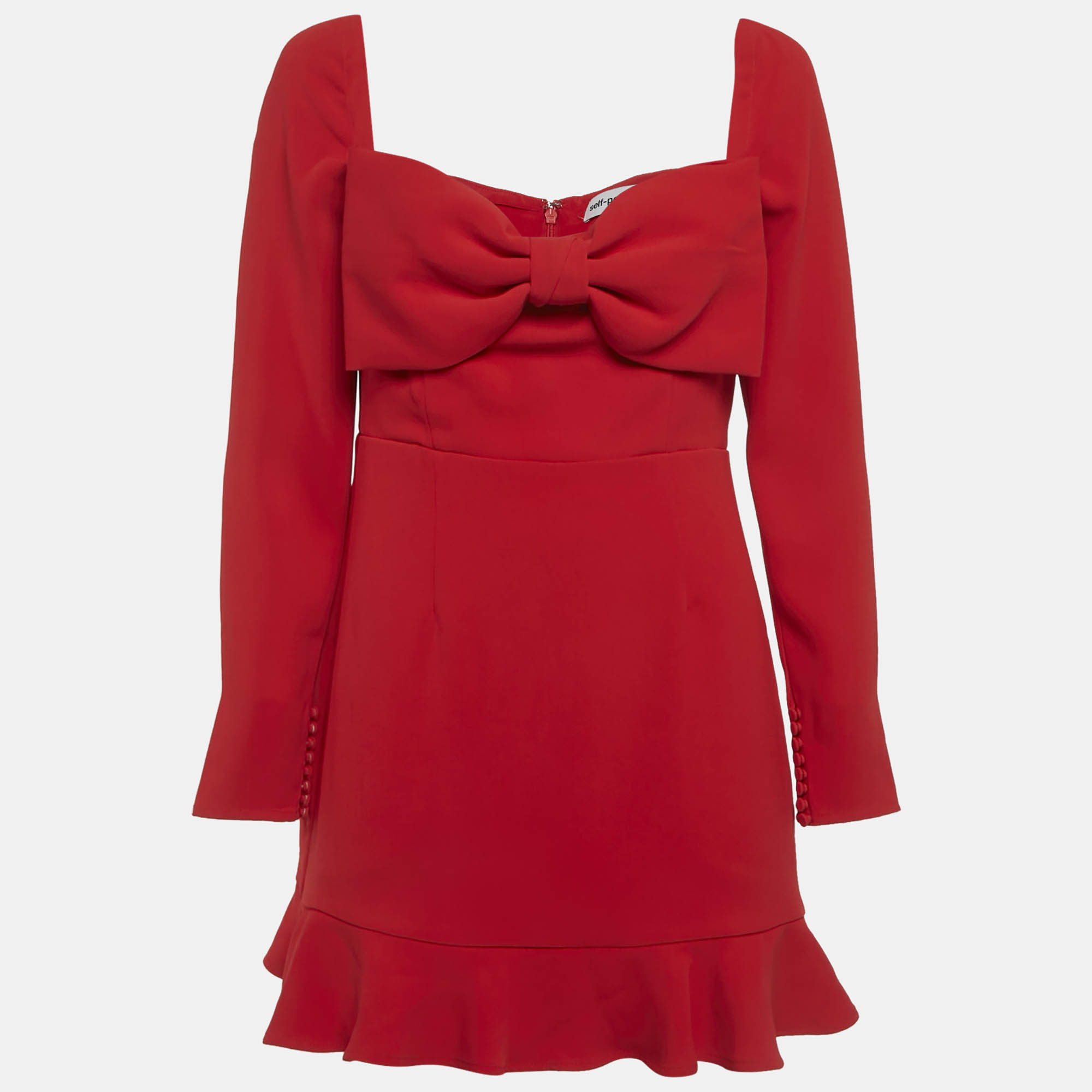 Self Portrait’s red crepe mini dress is shaped with a bow detail and flounced hem for a touch of playful drama. The vivid hue and sculpted cut nod to the label’s signature romantic meets modern aesthetic, making it a confident choice for occasions that call for bold yet feminine dressing.