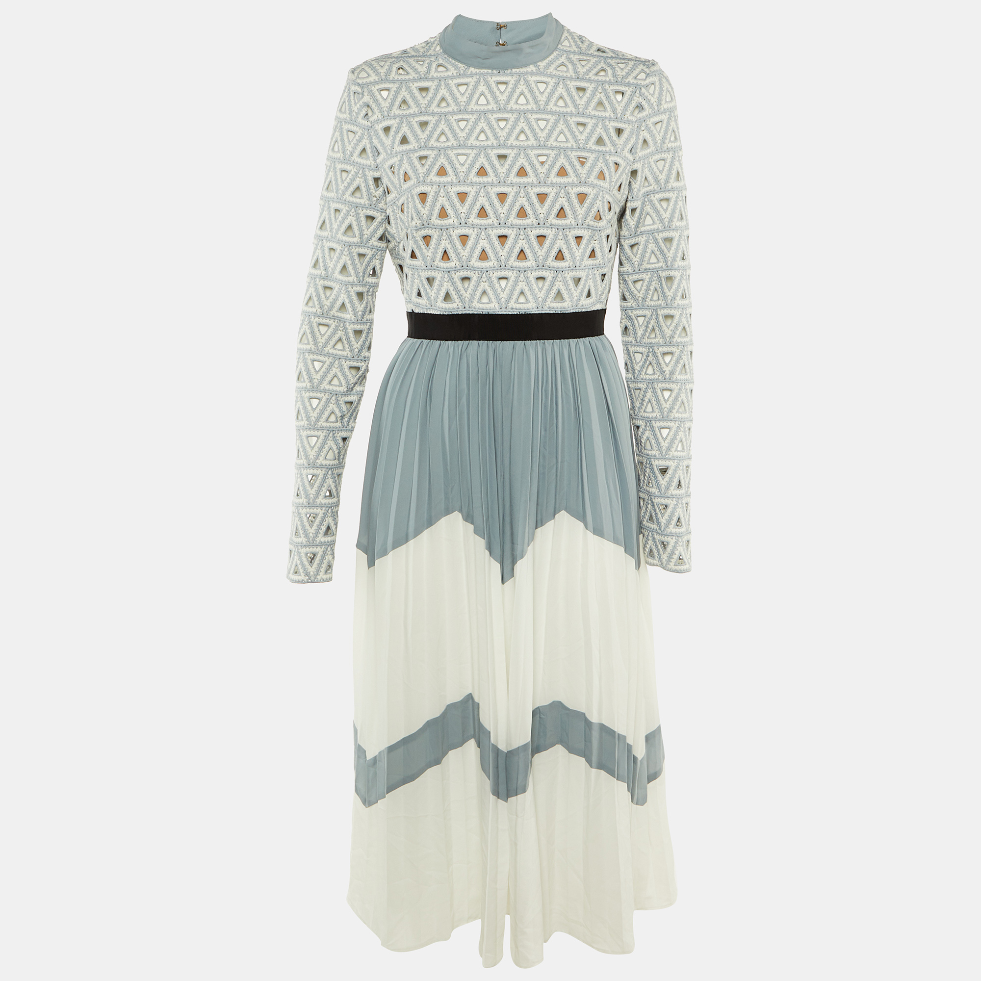 Combining delicate crochet with flowing crepe, this Self Portrait midi dress offers a feminine mix of texture and structure. Blue and white tones keep it fresh and refined. A polished option for brunches, events, or daytime elegance.