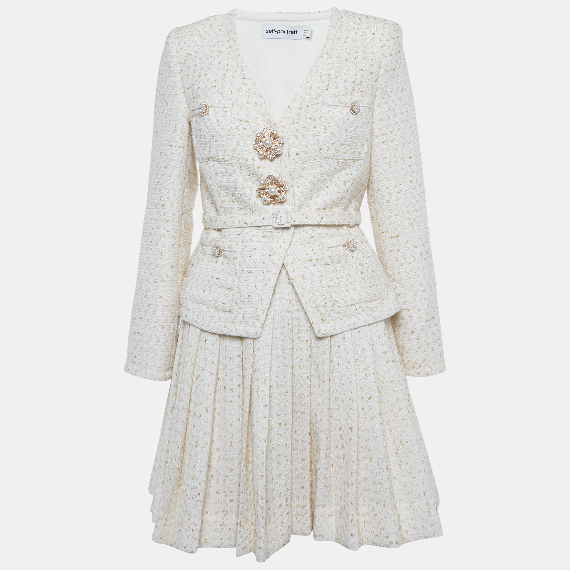 This Self Portrait mini jacket dress blends structure and sparkle with its cream metallic bouclé fabric. Featuring tailored lapels and polished buttons, it offers the perfect mix of classic elegance and contemporary edge. A chic choice for high tea events or night out glamour.