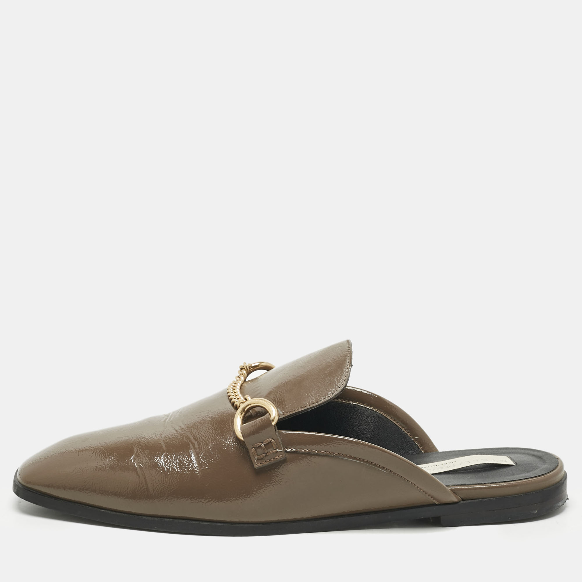 Stella McCartney’s mules pair modern polish with an easy slip on shape. Crafted in grey faux leather, they’re trimmed with a gleaming chain detail—proof that statement design can be both ethical and endlessly wearable.