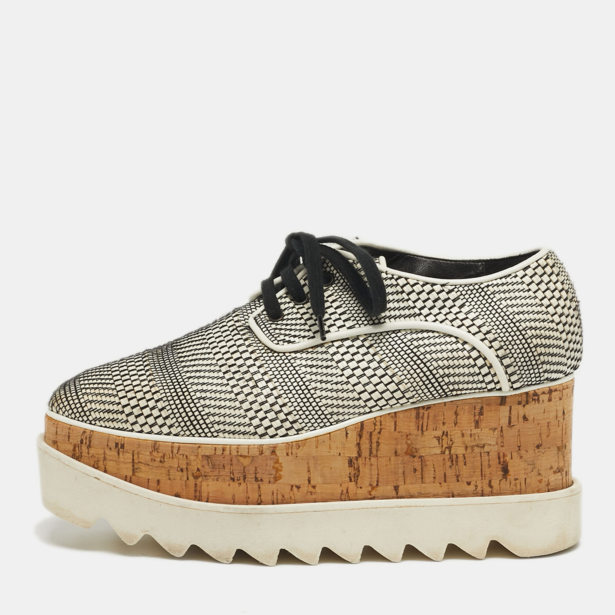 The Stella McCartney Elyse Star sneakers combine white and black faux leather with mesh detailing for a bold, eco conscious design. The elevated wedge sole adds height while maintaining comfort. A signature statement pair that blends sustainability with modern style.