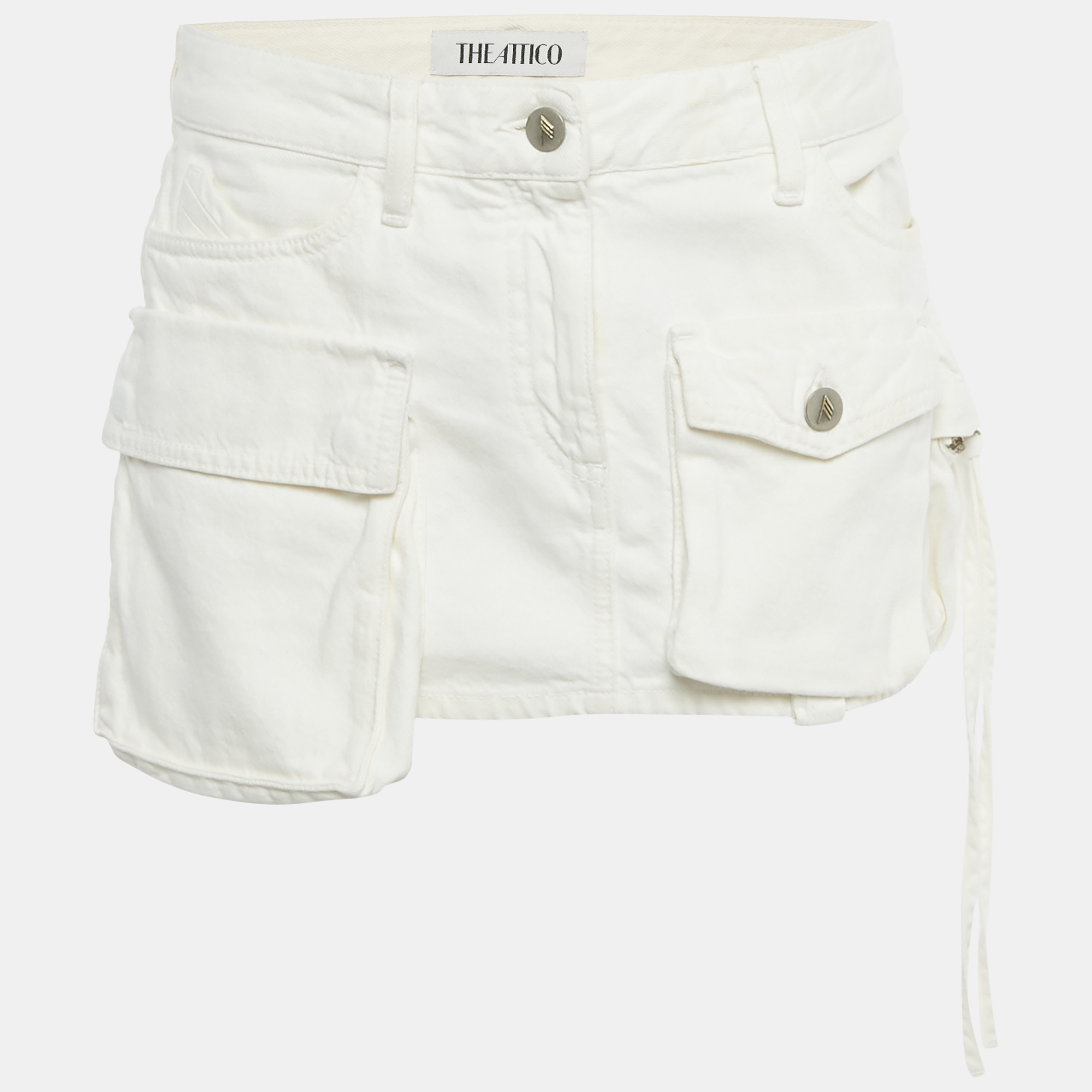 The Attico white denim mini skirt sits low on the waist, with cargo pockets adding subtle utilitarian flair. Pair this with a nice tee or a fitted knit to let the skirt’s details stand out.