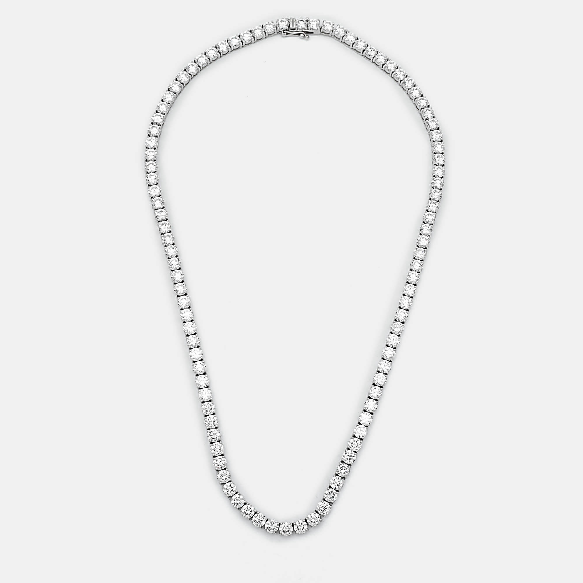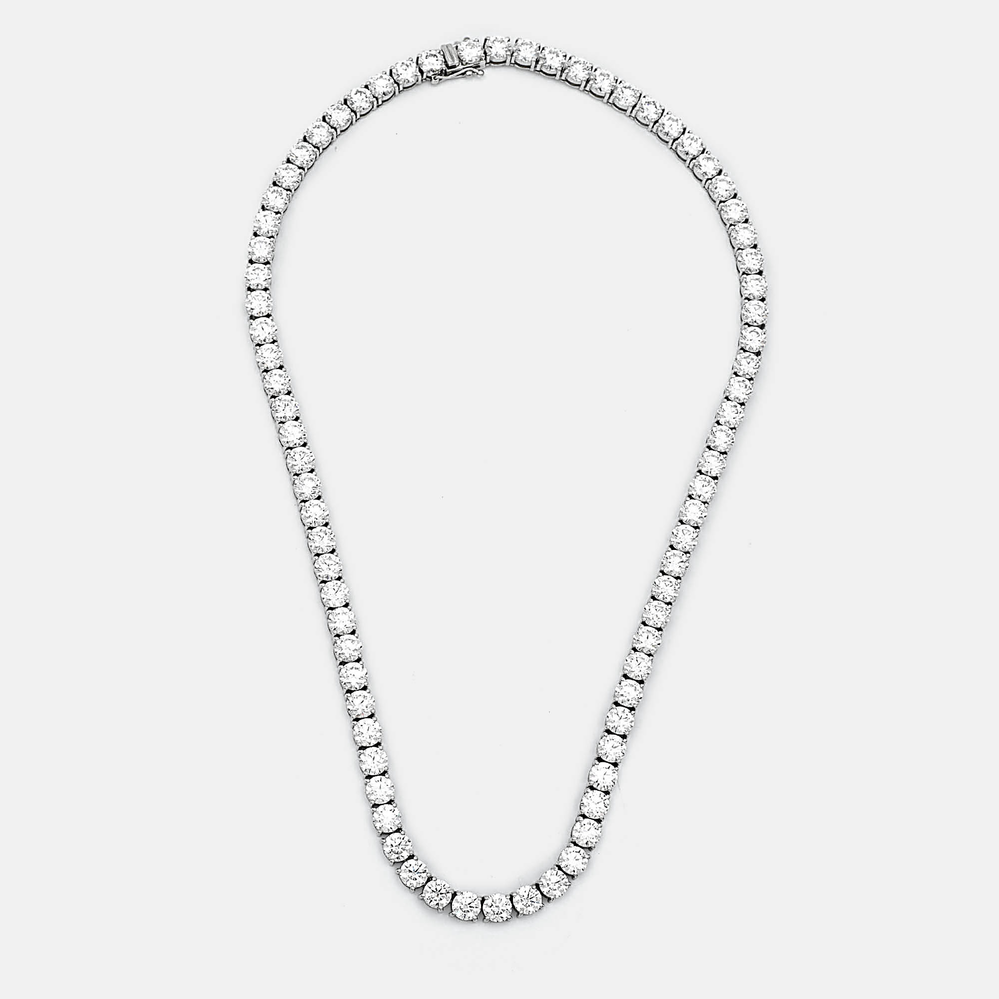 Drape yourself in pure brilliance with this breathtaking 18K white gold necklace, showcasing a mesmerizing 29.33 carats of round brilliant cut lab grown diamonds. Each radiant stone is meticulously set to ensure maximum fire and brilliance, making this necklace a true showstopper.