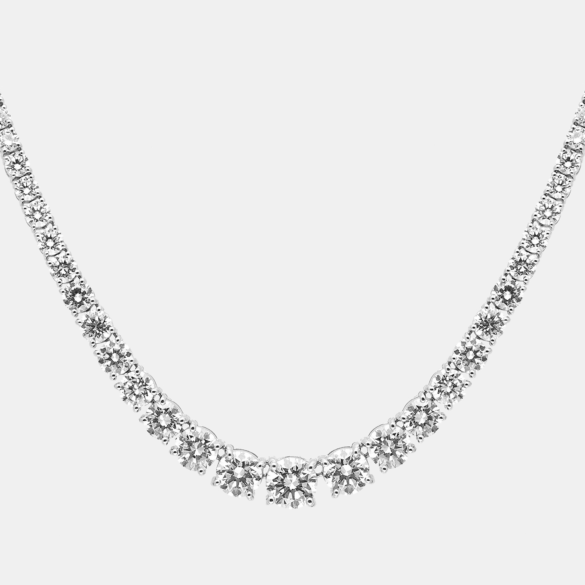 Understated yet radiant, this 18K white gold graduating necklace boasts 10.35 carats of round brilliant cut lab grown diamonds. Designed for effortless sophistication, it adds a luminous touch to any ensemble, whether worn solo or layered for a striking effect.