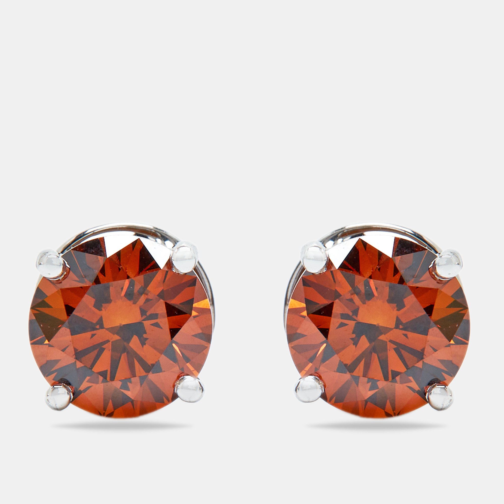 A rare glow, wrapped in warmth—these 4.00 carat round brownish orange lab grown diamonds radiate with golden fire. Set in cool 18k white gold, the contrast is intentional: fiery color meets gleam in a design that stands out.