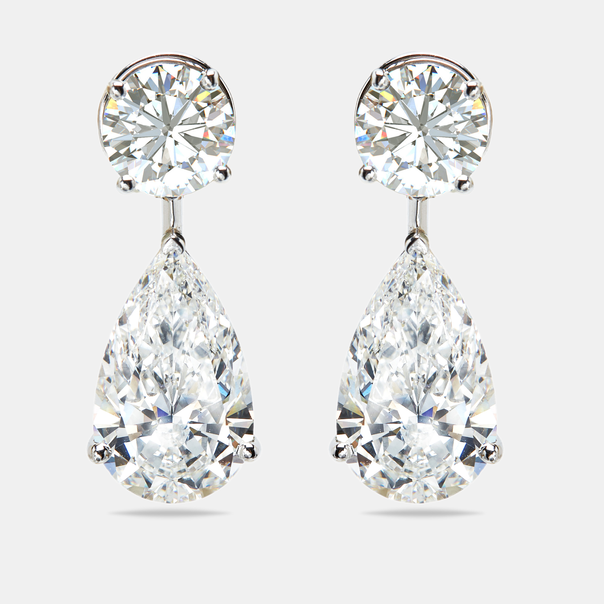 These 8.00 carat drop earrings pair classic round brilliant diamonds with the graceful taper of pear cuts. Set in 18k white gold, they move with quiet sparkle, elevating daywear and anchoring evening looks with equal ease.