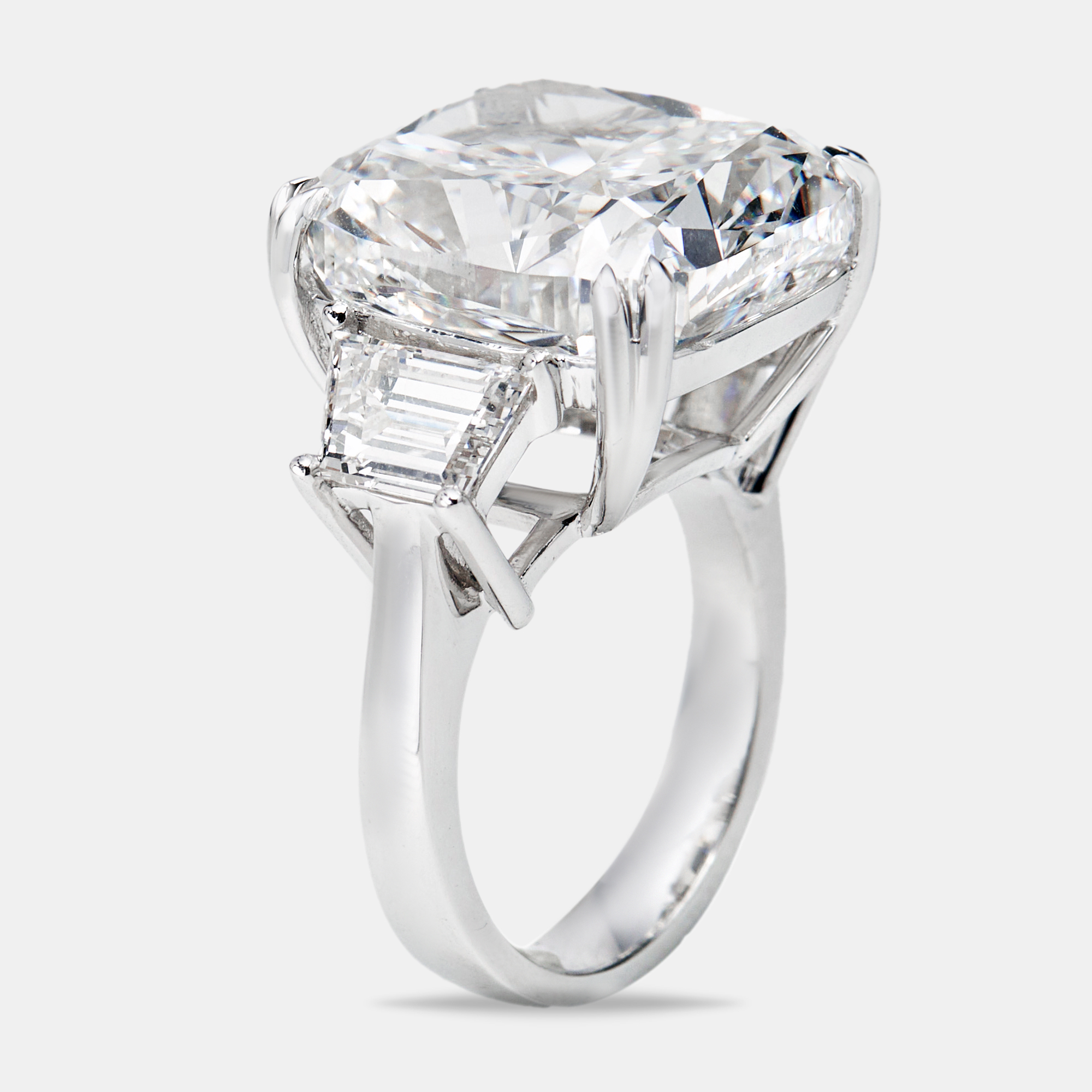 A dream in symmetry and shimmer, this 22.00 carat cushion cut diamond radiates soft brilliance. Trapezoid side stones enhance the depth of the centerpiece, all anchored in cool 18k white gold. A modern heirloom in the making.