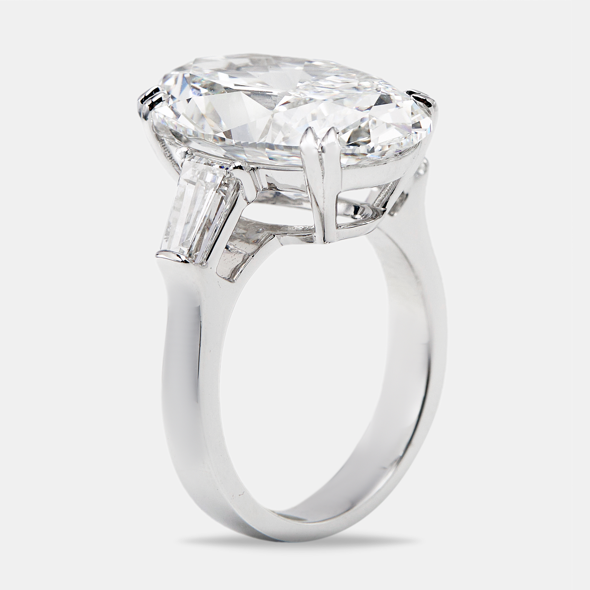 The 17.00 carat radiant cut is elevated by trapezoid shoulders that echo its brilliance. Crafted in 18k white gold, this ring merges crisp geometry with glowing warmth—decisive, dazzling, and unforgettable.