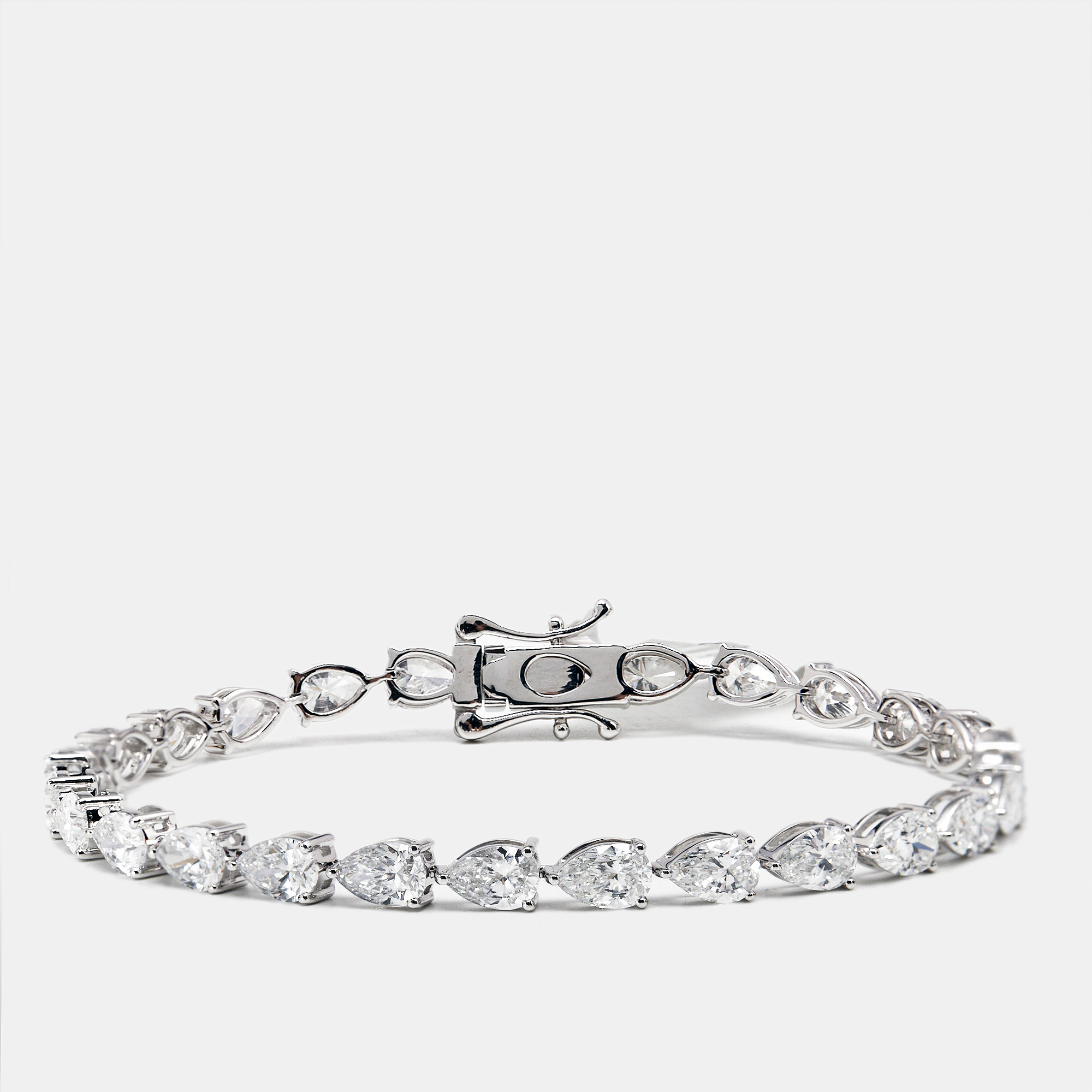 A graceful take on the classic tennis bracelet. This piece features about 10.06 carats of pear shaped lab grown diamonds, each one tapering to a point like a drop of light. The gentle rhythm of the silhouette, set in 18k white gold, creates a soft glimmer with surprising presence.