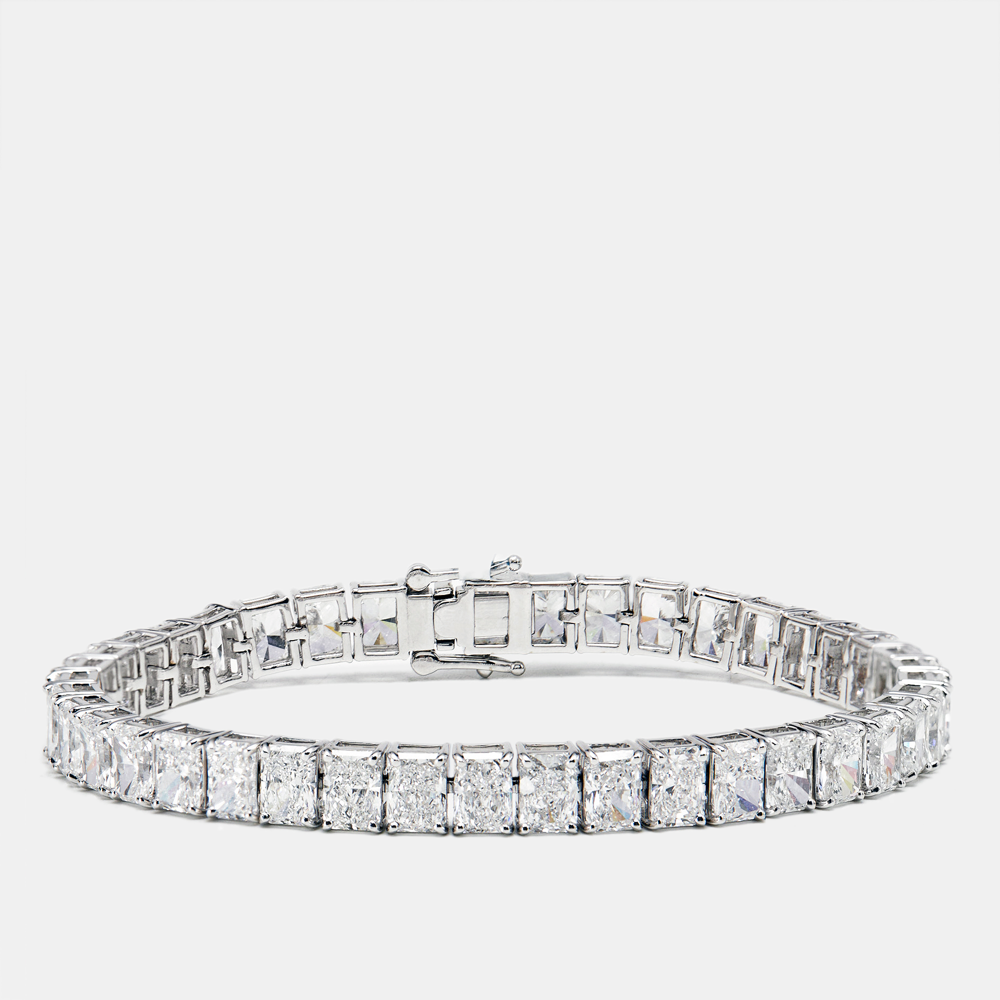 A bold twist on a classic, this tennis bracelet showcases about 20.51 carats of radiant cut lab grown diamonds, each set in gleaming 18k white gold. The geometric brilliance of the radiant cut adds modern edge, while the uniformity of the setting delivers timeless appeal. Clean, fluid, and impeccably crafted—designed to wear beautifully, day or night.