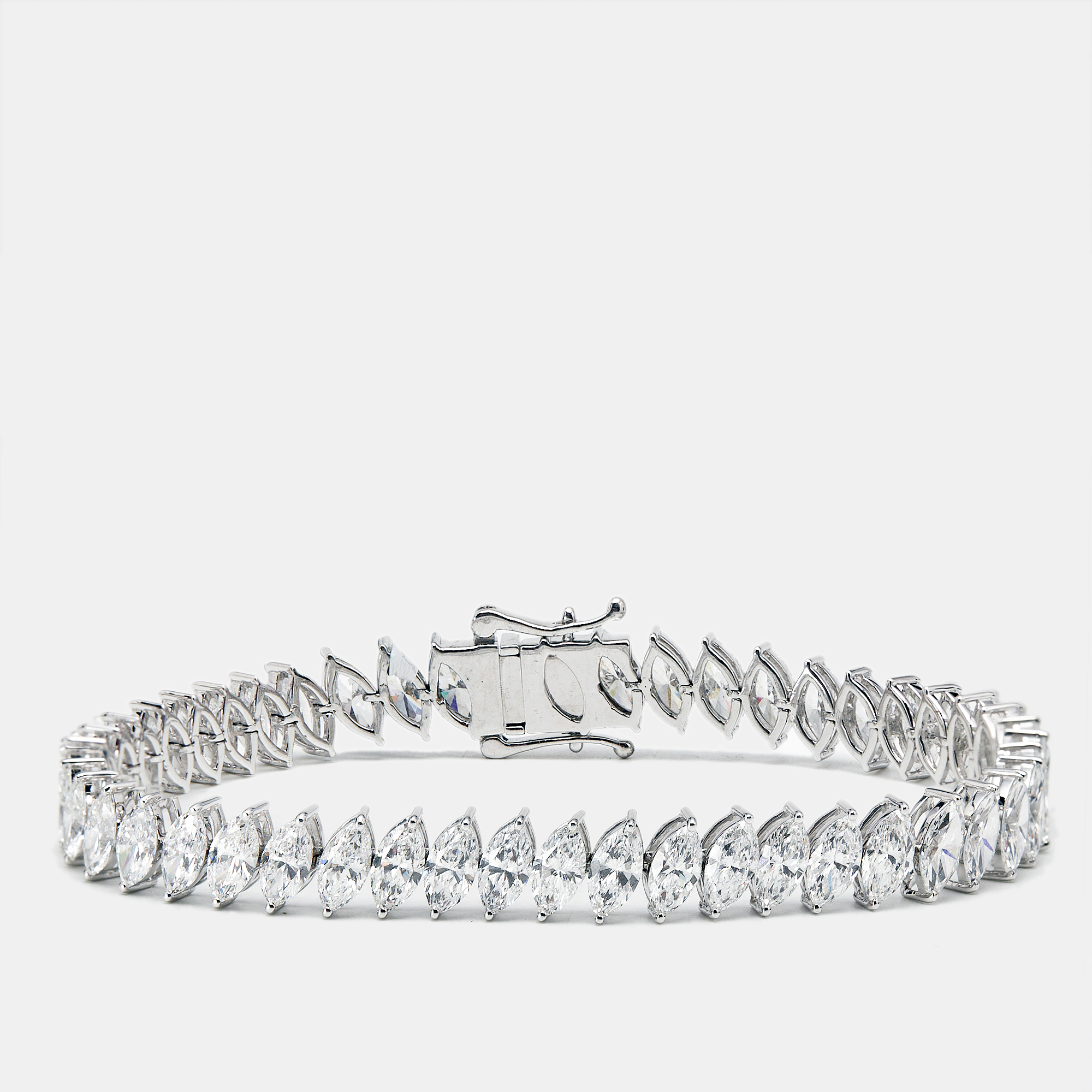 Sculptural and striking, this tennis bracelet features marquise cut lab grown diamonds that stretch across the wrist like a string of light. With their pointed tips and curved sides, each stone adds a touch of vintage drama to the clean 18k white gold setting.
