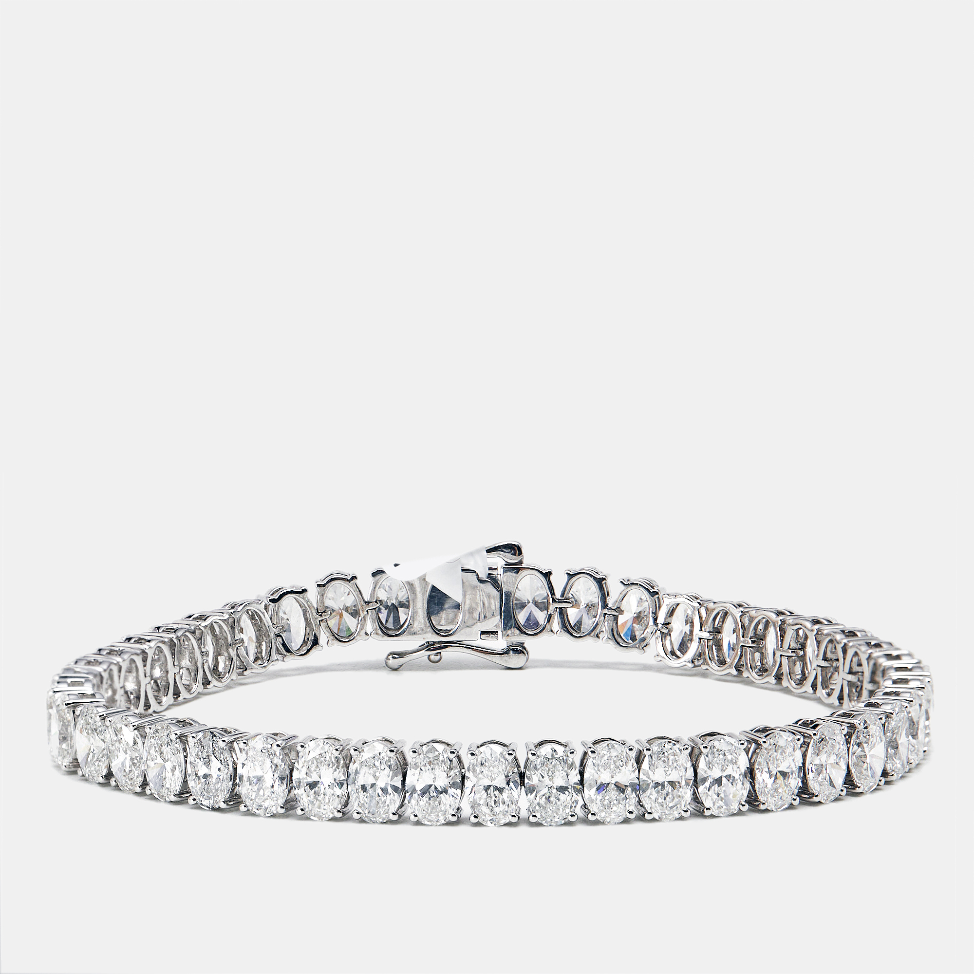 Long lines. Endless sparkle. This 17.56 carat tennis bracelet is strung with oval brilliant cut lab grown diamonds—each one shaped to maximize fire and flow. Set in bright 18k white gold, it offers impact with an easy kind of elegance.