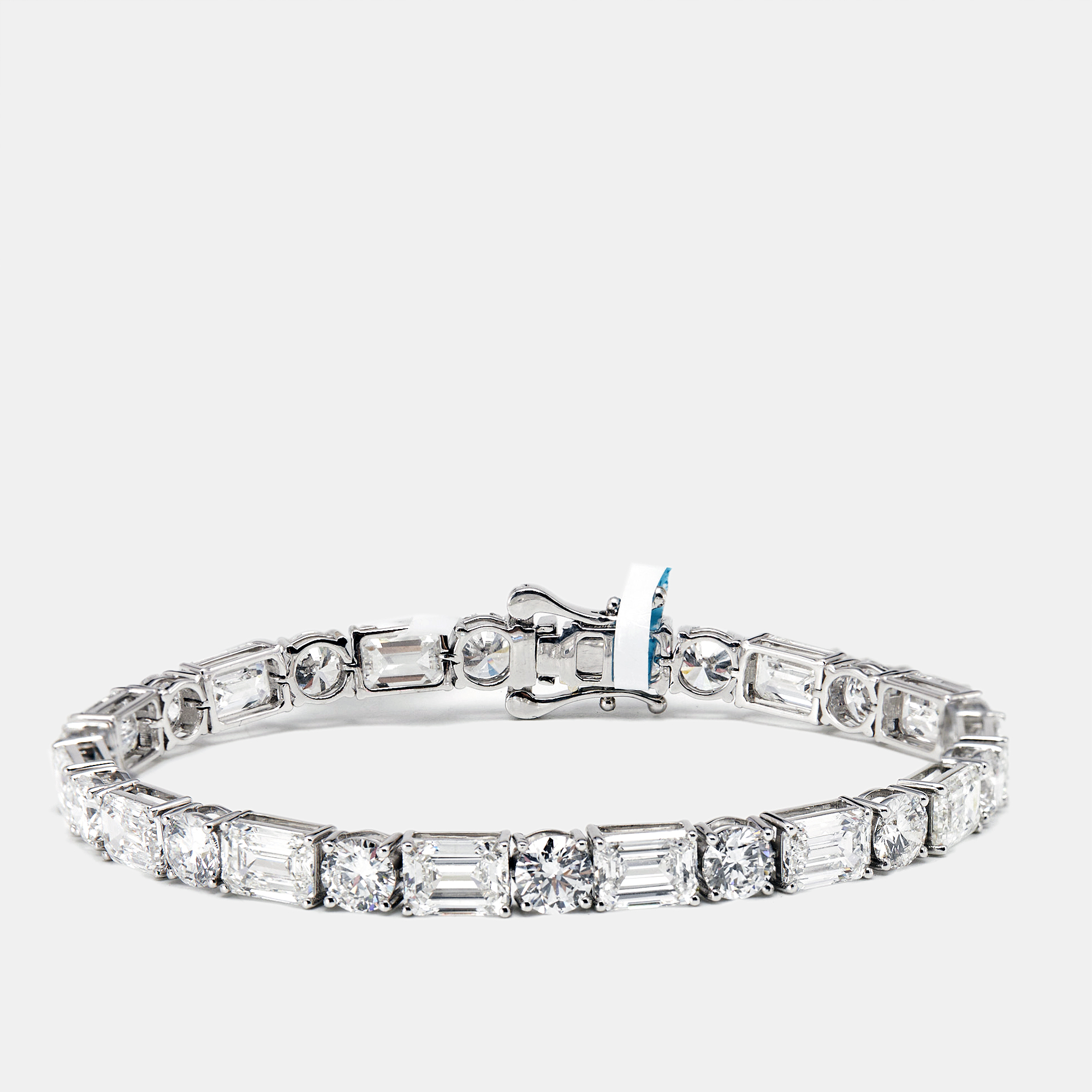 This 21.86 carat bracelet pairs round brilliant and emerald cut lab grown diamonds in a rhythm of sparkle and shine. The mix of shapes gives the classic tennis bracelet an architectural twist, all set in 18k white gold.