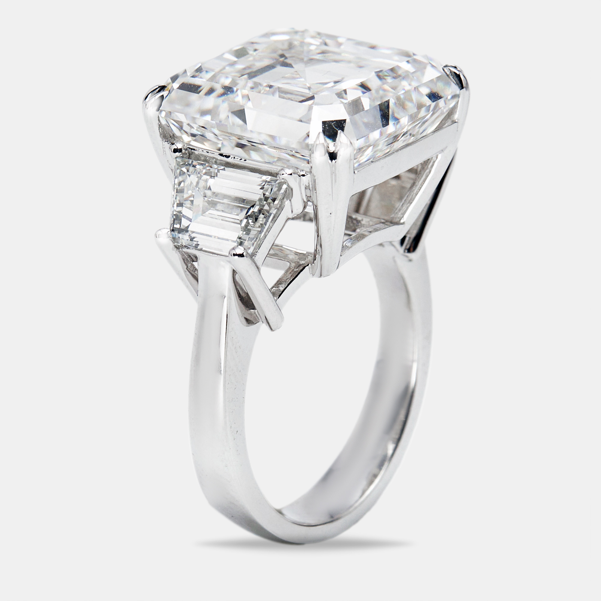 This 18.50 carat statement ring is an investment piece. The Asscher cuts mirror like clarity is flanked by perfectly matched trapezoids, forming a luminous trio on a sleek 18k white gold band. Impeccably cut and destined to be admired.
