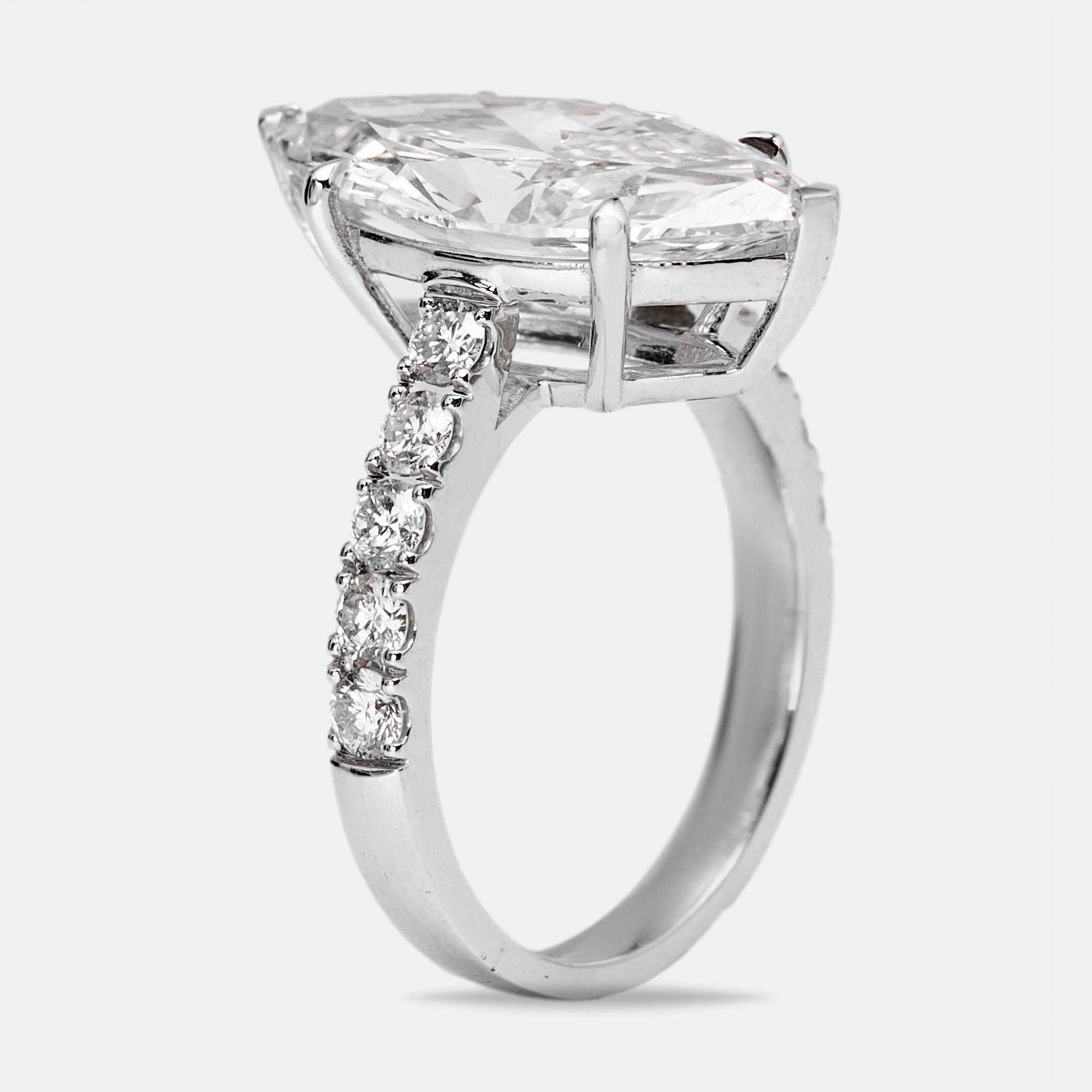 Sharp yet soft. This 5.60 carat ring features the elegant sweep of a marquise diamond, balanced by shimmering round stones, all set in crisp 18k white gold. An unexpected twist on a classic.