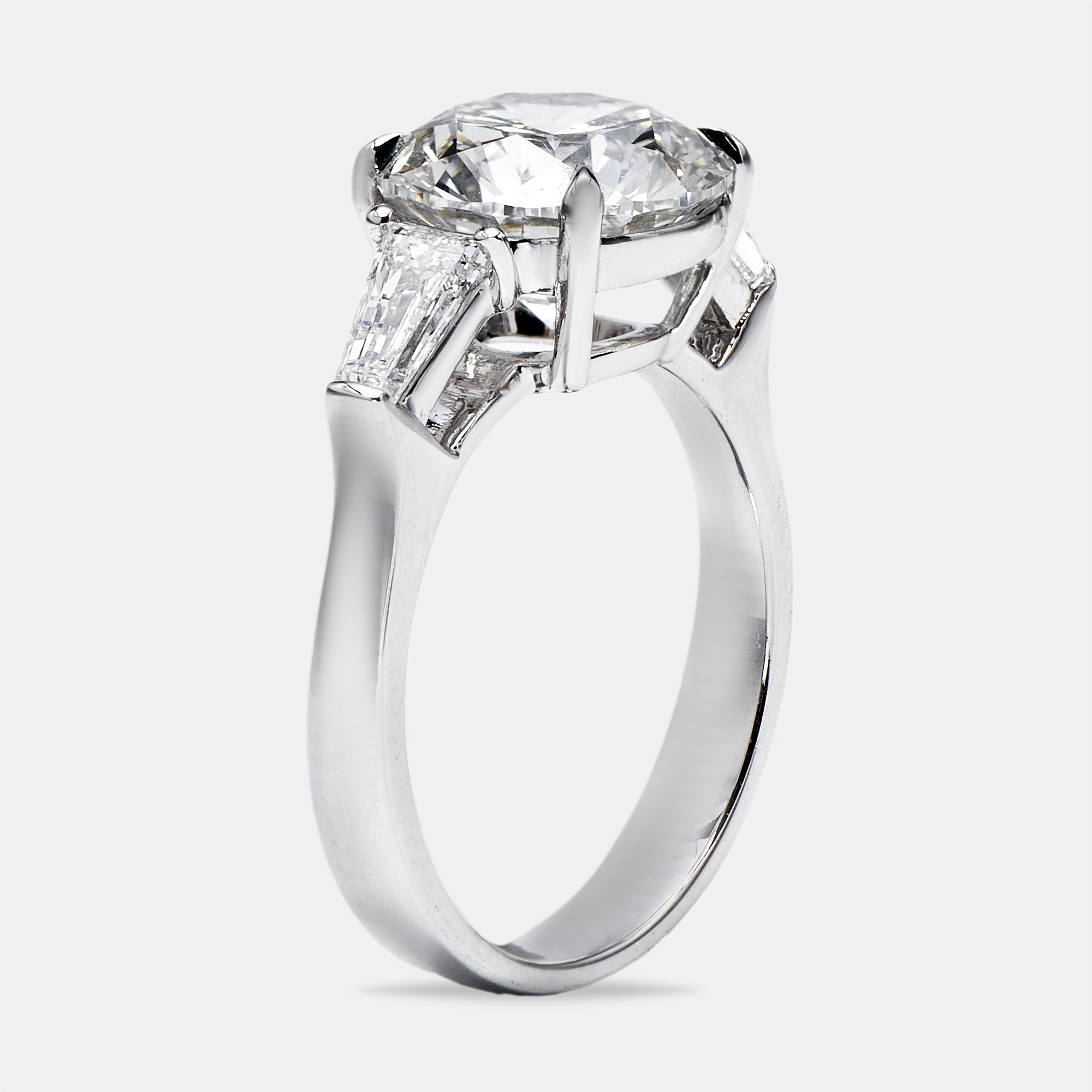 A stunning womens ring showcasing a 4.60 carat combination of an emerald cut lab grown diamond, accompanied by trapezoid side stones. Set in 18k white gold, the ring offers a symmetrical silhouette and classic shine for every occasion.