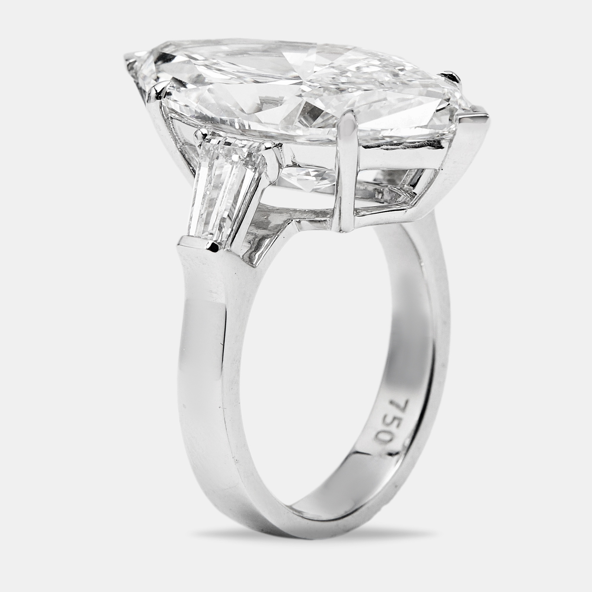 Theres precision in every line of this 10.50 carat ring. A bold emerald cut center draws the eye with its clean symmetry, while trapezoid side stones sharpen the silhouette without stealing focus. Set in 18k white gold for a stunning finish.