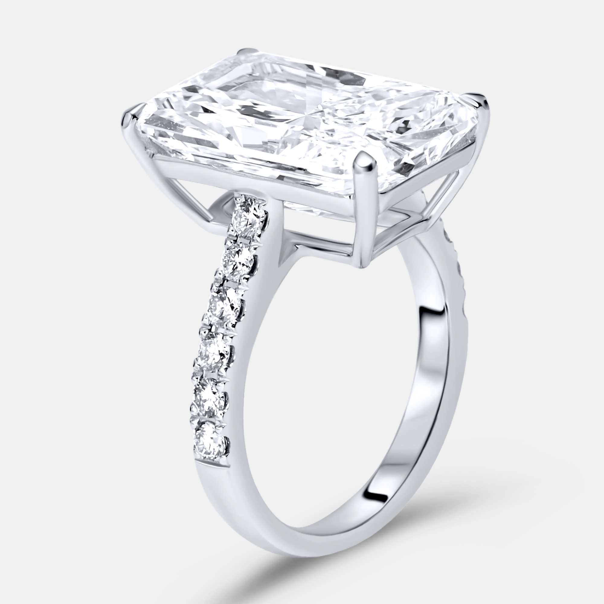 A 7 cts radiant cut diamond anchors this design, sharp and brilliant, with trapezoid side stones that echo its geometry. The 18k white gold setting keeps the focus on light and proportion. Every angle considered, every facet purposeful — this is beauty in high definition.