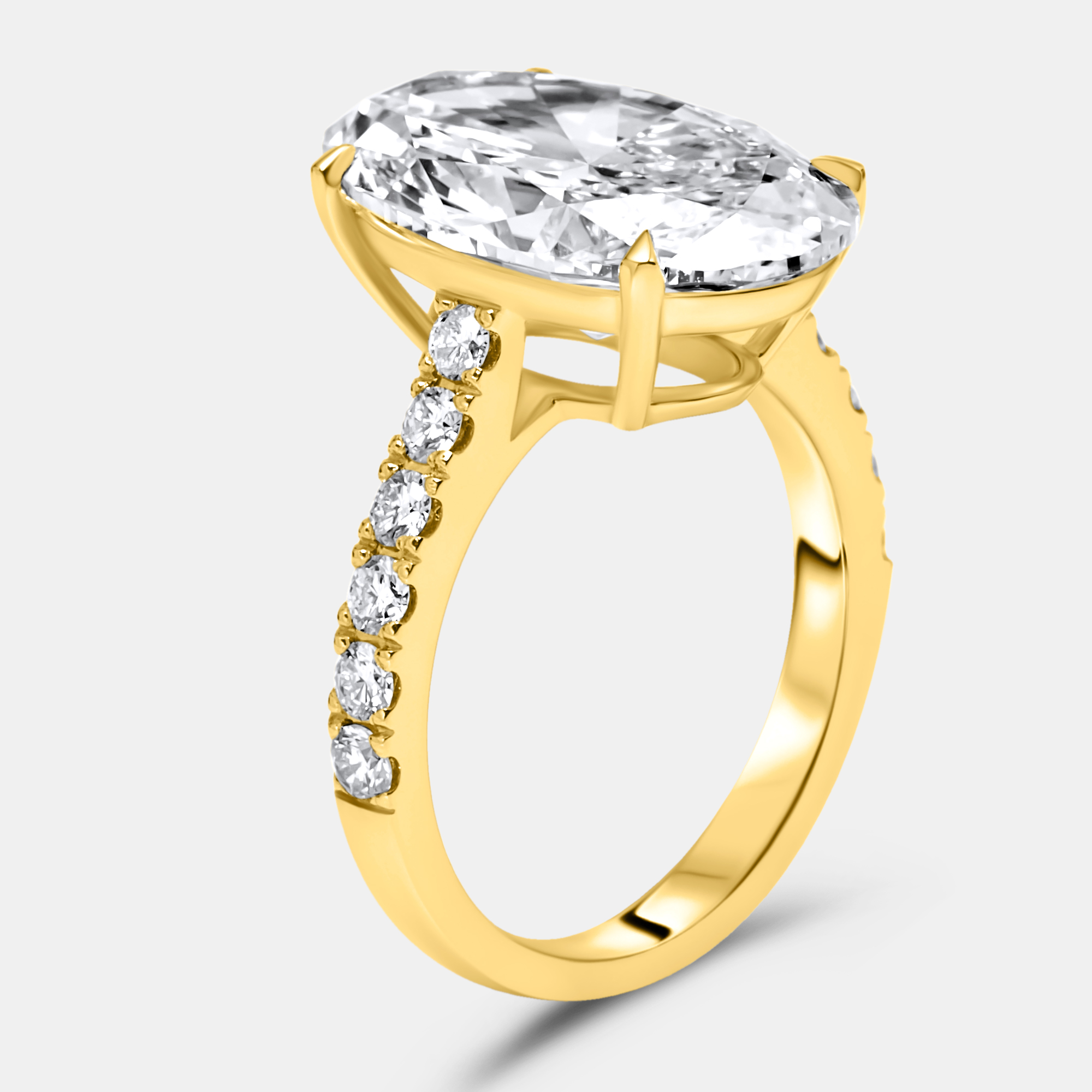 Golden light and brilliance come together in this 7.49 cts diamond ring. An oval brilliant cut center glows with soft fire, framed by round diamonds that add gentle lift and shimmer. The warmth of 18k yellow gold enhances every facet, giving the piece an easy radiance.