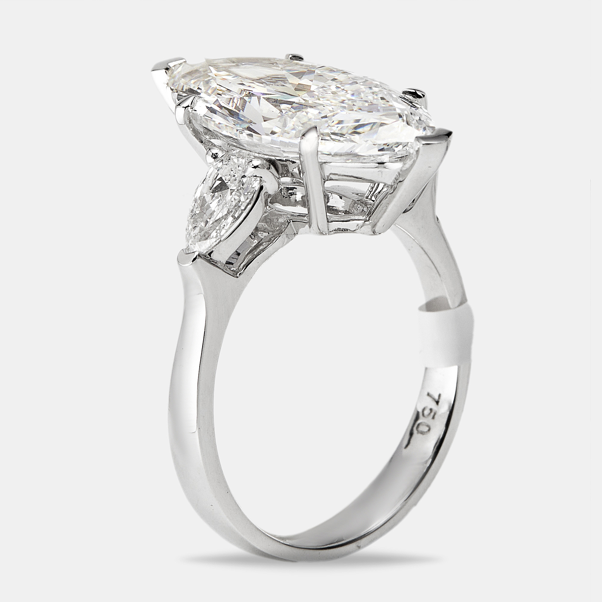Three pear shaped diamonds create a soft, sculptural rhythm across the finger. The center stone draws the eye with its graceful drop, while the two on either side mirror its shape in perfect balance. Set in 18k white gold, the 7.7 cts of brilliance feel fluid and full of light.