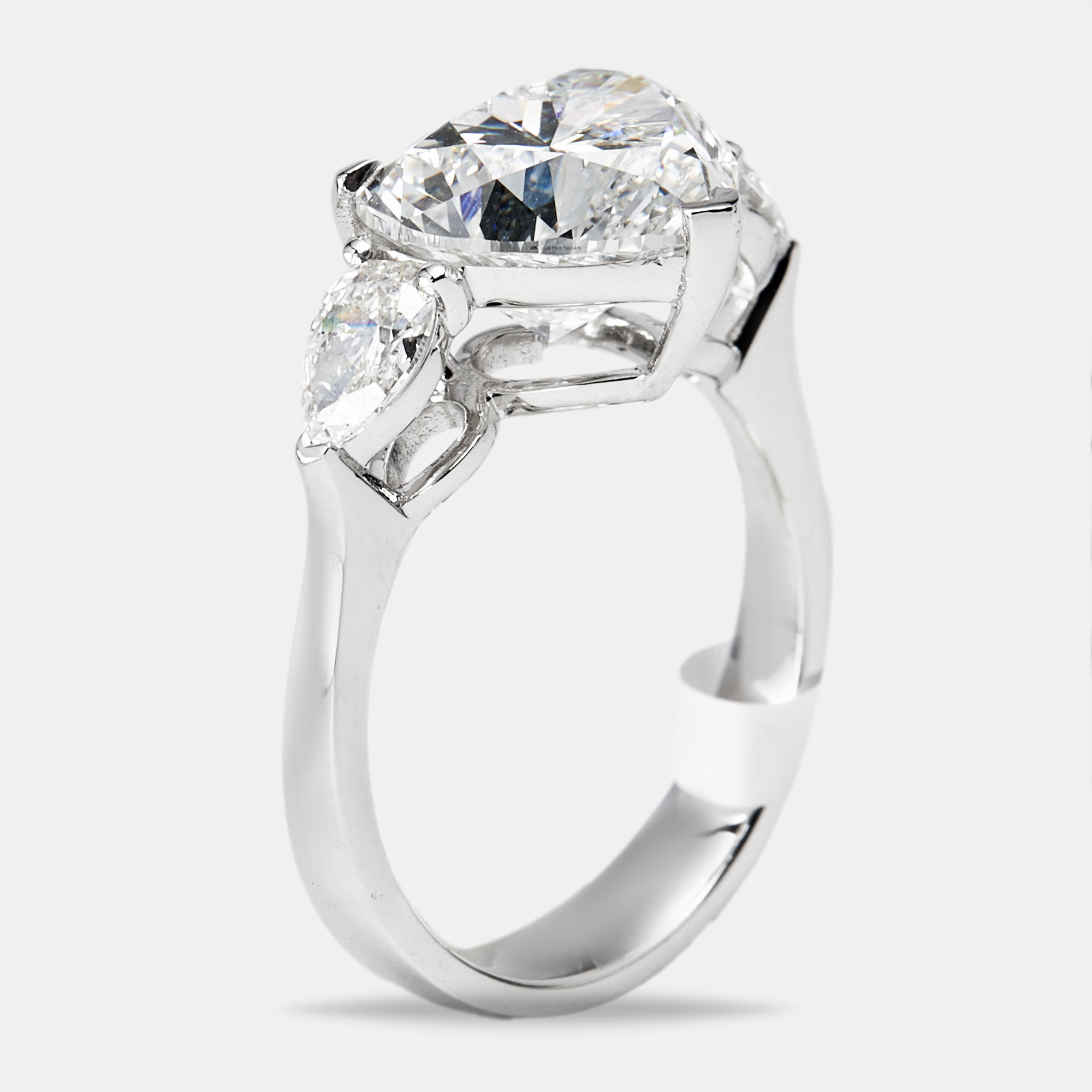 Three pear shaped diamonds create a soft, sculptural rhythm across the finger. The center stone draws the eye with its graceful drop, while the two on either side mirror its shape in perfect balance. Set in 18k white gold, the 7.7 cts of brilliance feel fluid and full of light.