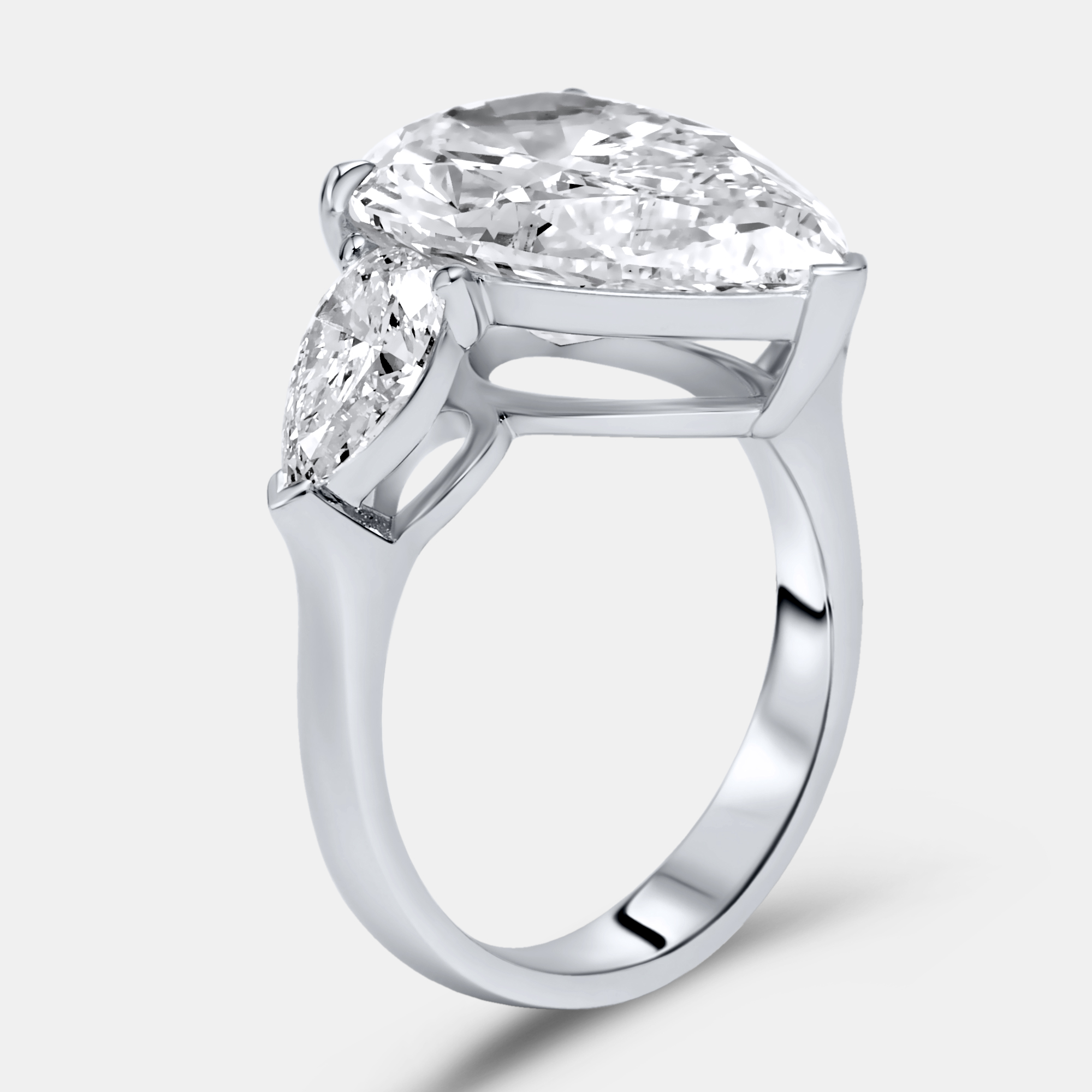 Three pear shaped diamonds create a soft, sculptural rhythm across the finger. The center stone draws the eye with its graceful drop, while the two on either side mirror its shape in perfect balance. Set in 18k white gold, the 7.7 cts of brilliance feel fluid and full of light.