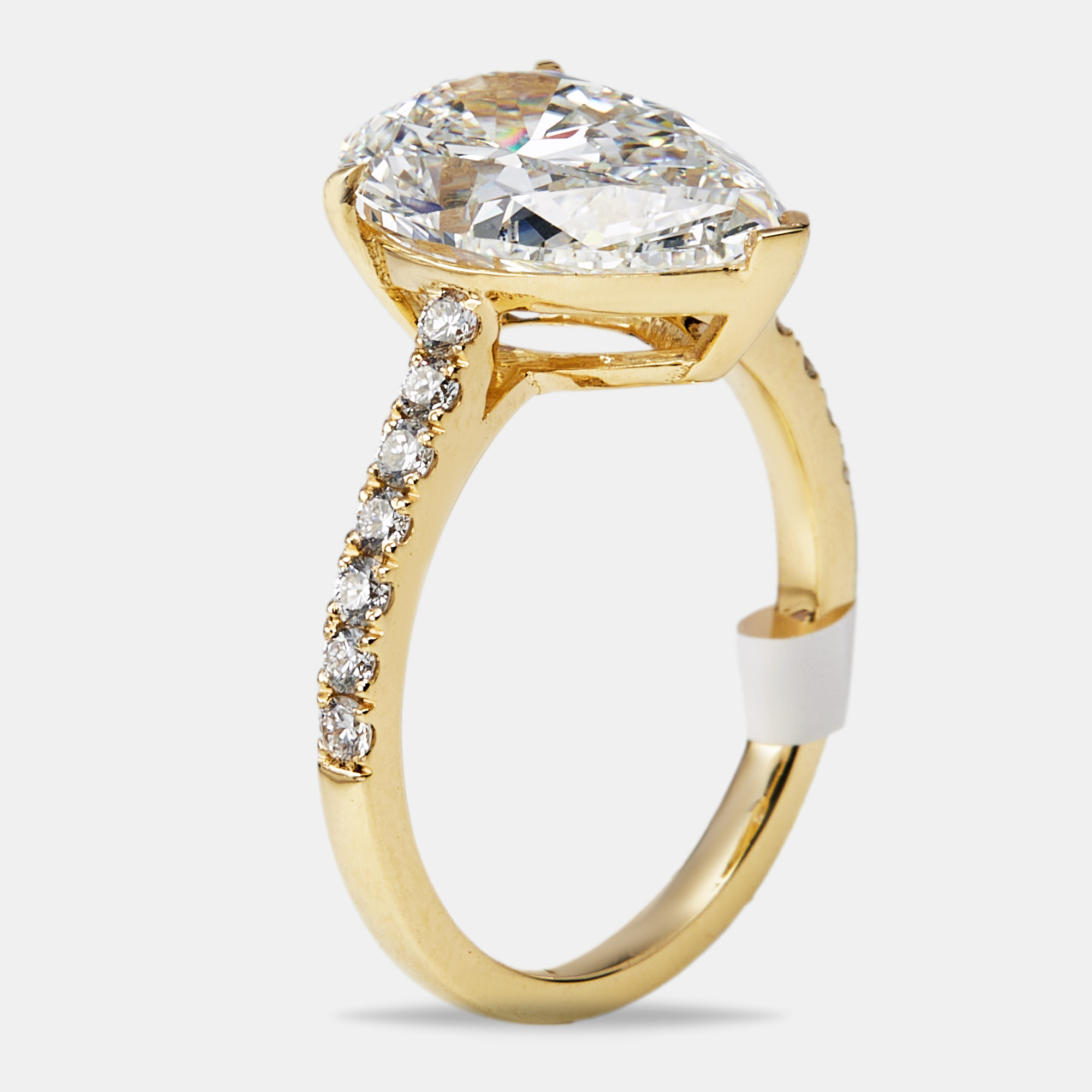A pear shaped diamond draws the eye with its gentle curve, held in warm 18k yellow gold. Round diamonds fall, catching light in soft glints that feel almost weightless. With 4.3 carats of lab grown diamonds, this ring feels golden in every sense.