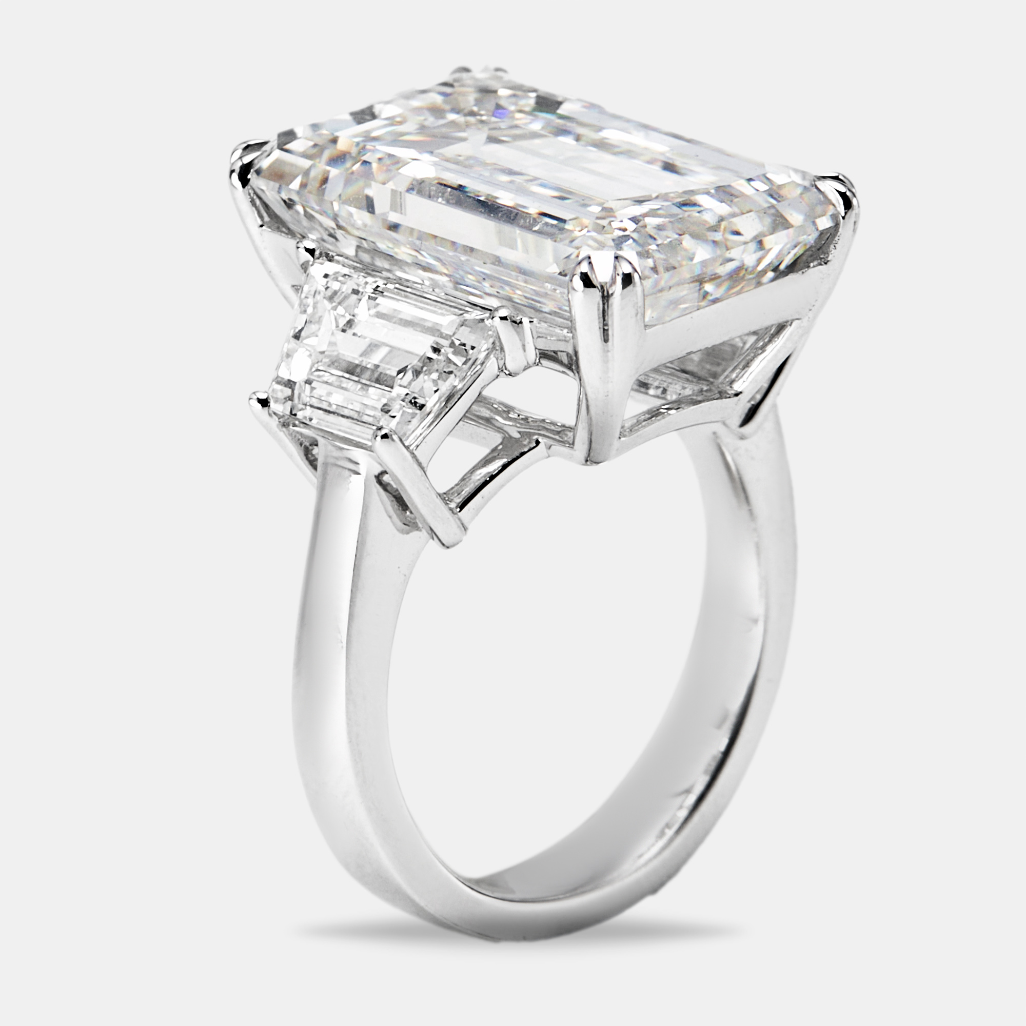 Designed with bold geometry and exceptional carat weight, this 17.00 cts ring balances modernism and craftsmanship. The radiant cut center stone is rich with light play and framed by trapezoid diamonds that extend the visual field with clarity and precision. Sculpted in 18k white gold, the setting is minimal yet exacting, crafted to elevate each facet without distraction.