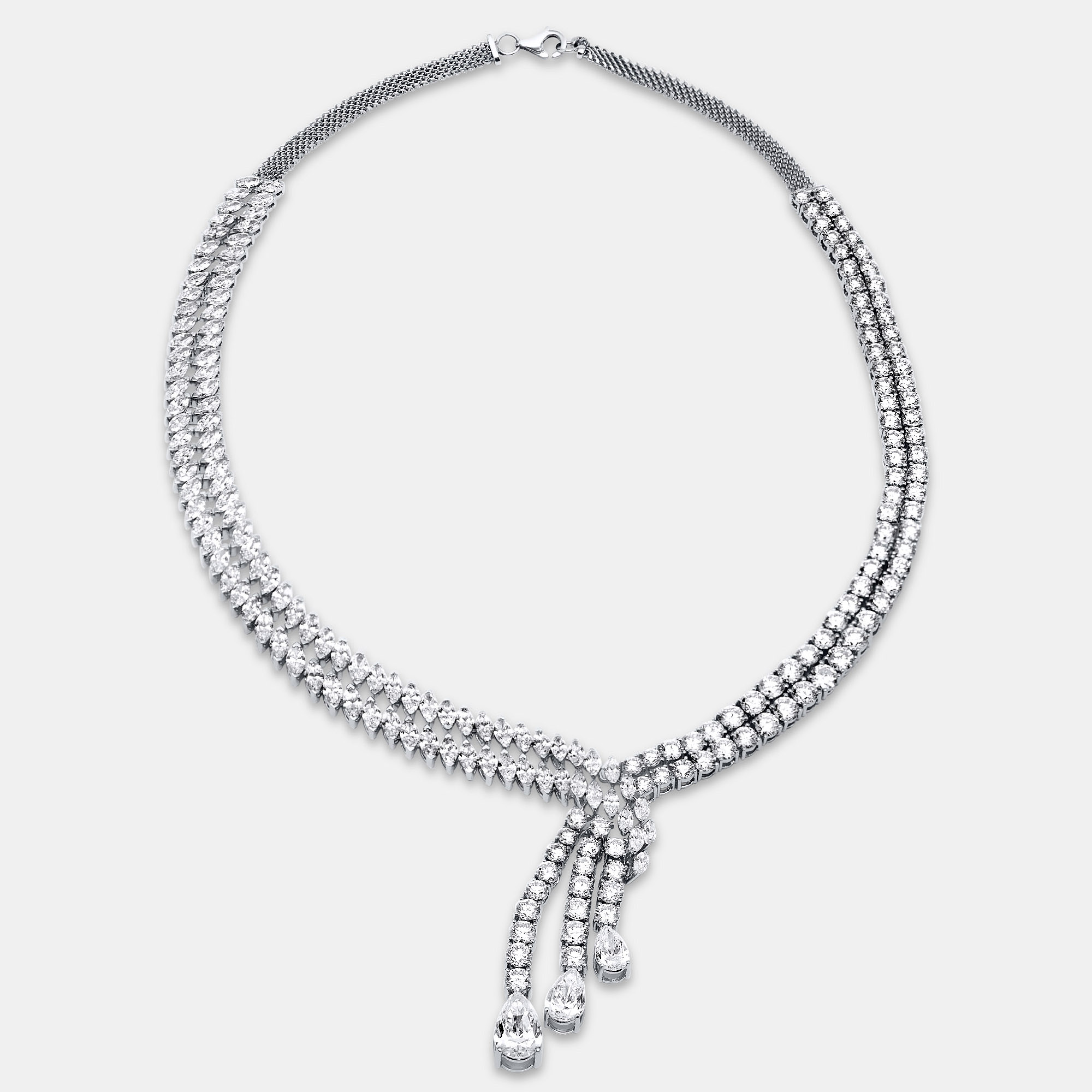 A study in grace and geometry, this womens necklace lets shape tell the story. Pear, marquise, and round cut lab grown diamonds form a flowing rhythm, each one perfectly matched for brilliance. Against the cool gleam of 18K white gold, the stones seem to move with their own quiet pulse — steady, certain, unforgettable.