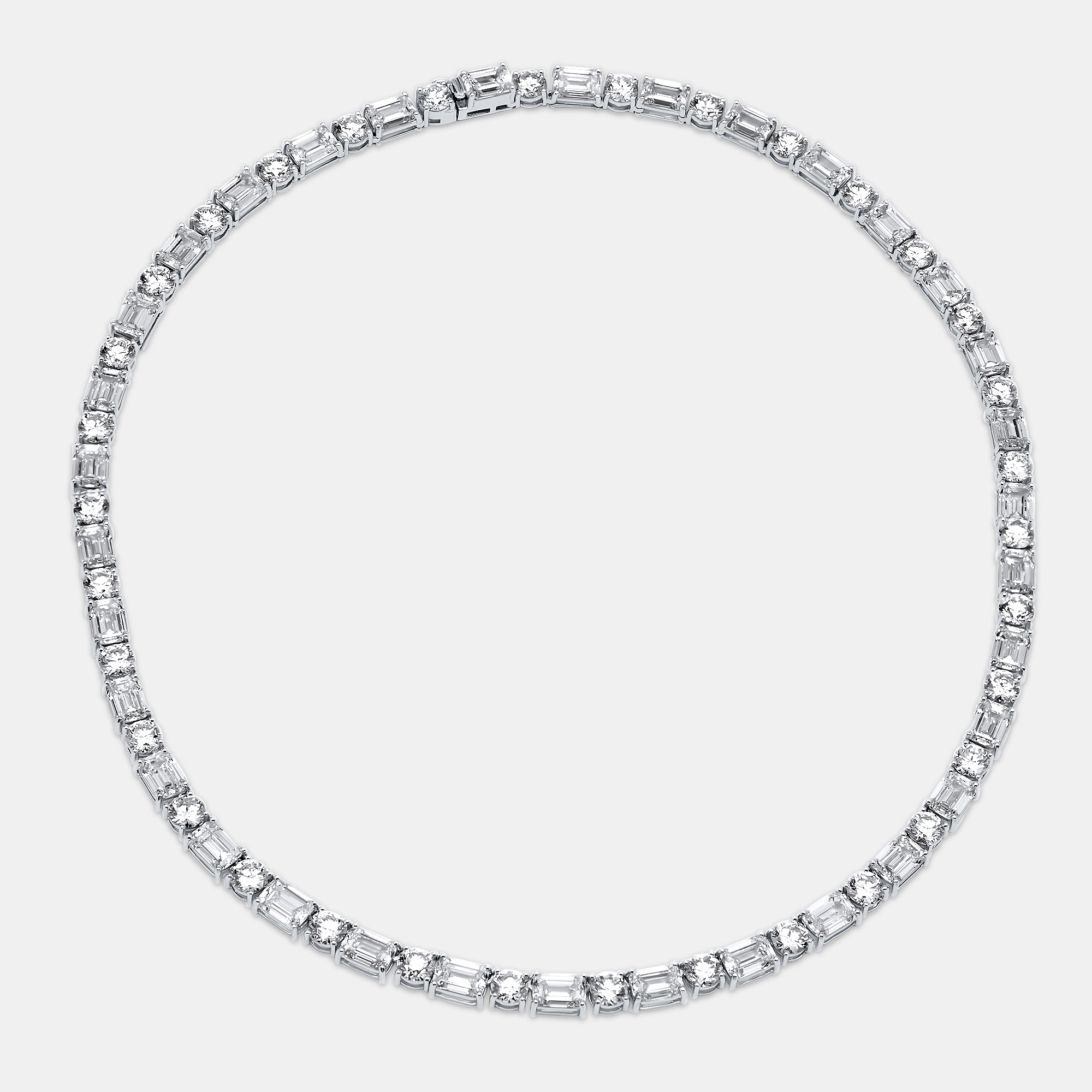 A perfect circle, alive with light. This necklace alternates round and emerald cut lab grown diamonds in an unbroken loop, each stone chosen for its clarity, fire, and harmony with the next. The geometry is deliberate — round cuts offering a soft, eternal sparkle, emerald cuts lending flashes of crisp, architectural light. Set in cool 18K white gold, the full circle design sits like a crown at the collarbone, its brilliance uninterrupted, its elegance absolute.