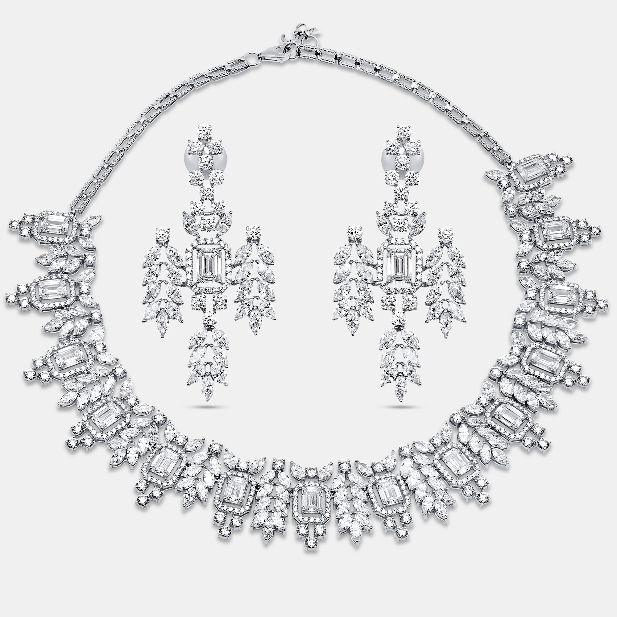 This is light, multiplied. Pear, emerald, marquise, and round cuts gather in seamless harmony, their shapes dancing across the neckline in 18k white gold. The design feels alive — like a constellation in motion — each stone a carefully placed star in a universe made just for you.