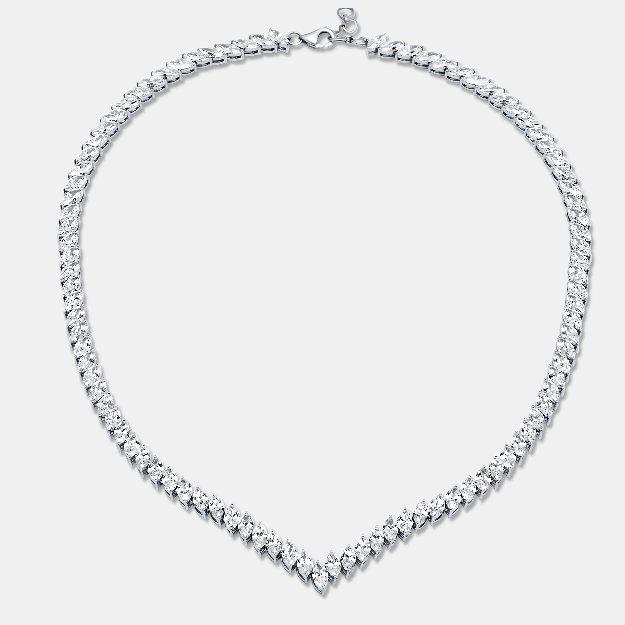 A diamond necklace that captures motion even at rest — each marquise cut diamond tapering to a point like a drop of light in flight. Set in 18K white gold, the stones align in a graceful line, their elongated silhouettes creating a look that is both delicate and dramatic.