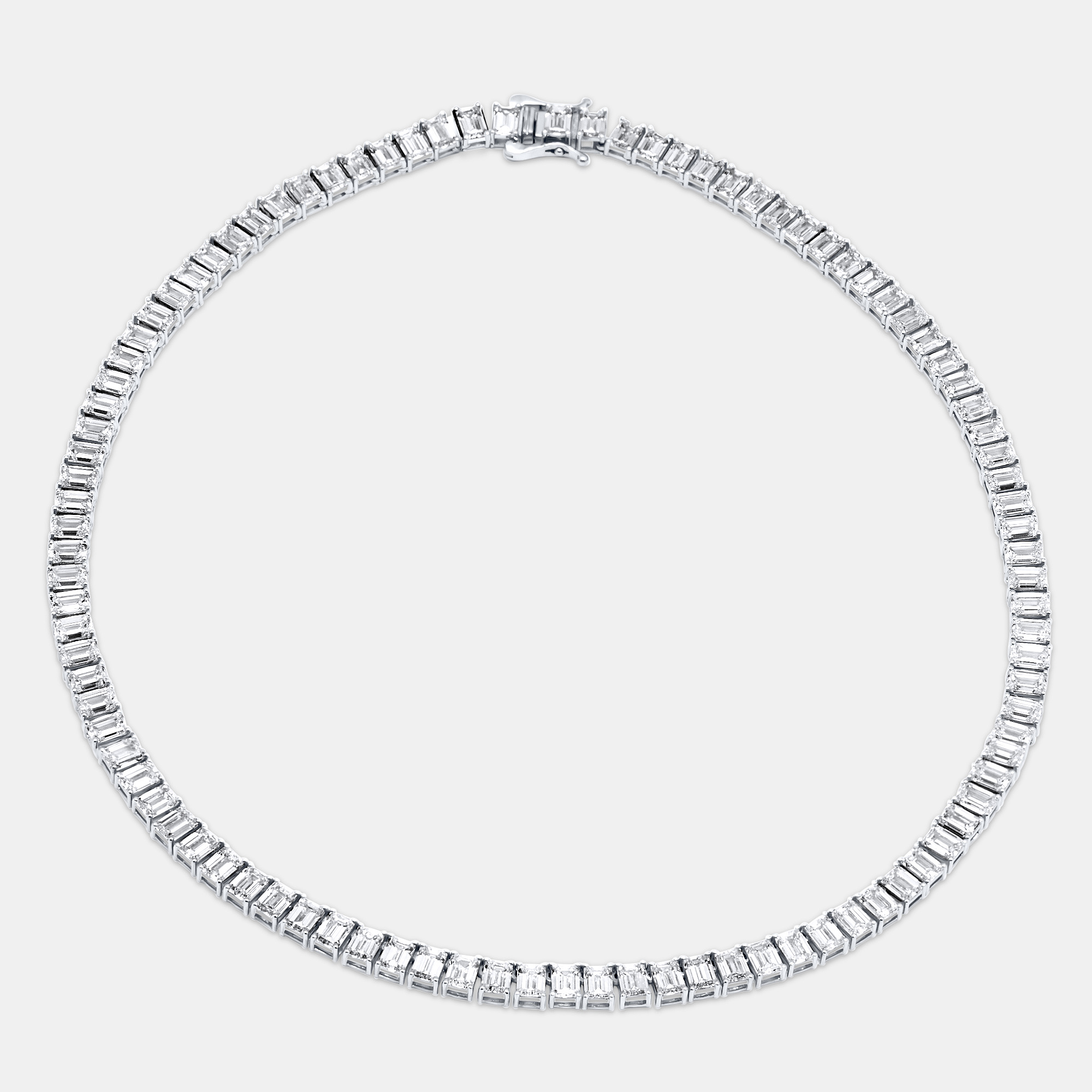 Emerald cut diamonds, with their endless corridors of light, form the backbone of this striking design. The 40.93 carats of lab grown stones are perfectly matched for clarity and hue, each one a window into brilliance. Set in sleek 18k white gold, the necklace is unapologetically architectural — strong lines, balanced symmetry, and a presence that commands the room.