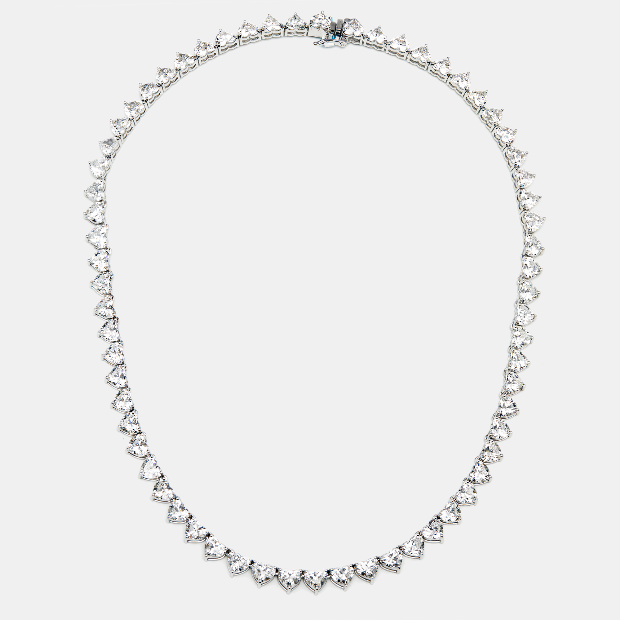 This necklace feels like a love letter written in diamonds. 33.5 carats of heart shaped brilliance shimmer in sequence, their gentle curves catching the light with a softness that belies their power. Against the purity of white gold, it becomes an ode to intimacy, longing, and devotion.