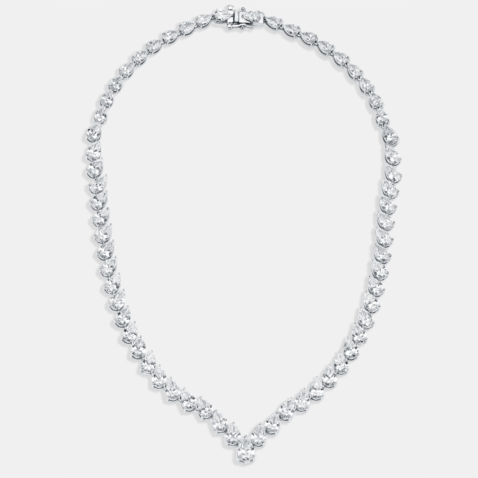 Like dew drops strung together at dawn, pear cut lab grown diamonds, 30 carats in all, sit gracefully along the neckline. Their elongated form gives the necklace a lyrical movement, a sense of water flowing, light bending. A creation in white gold that feels at once fresh, fluid, and eternal.