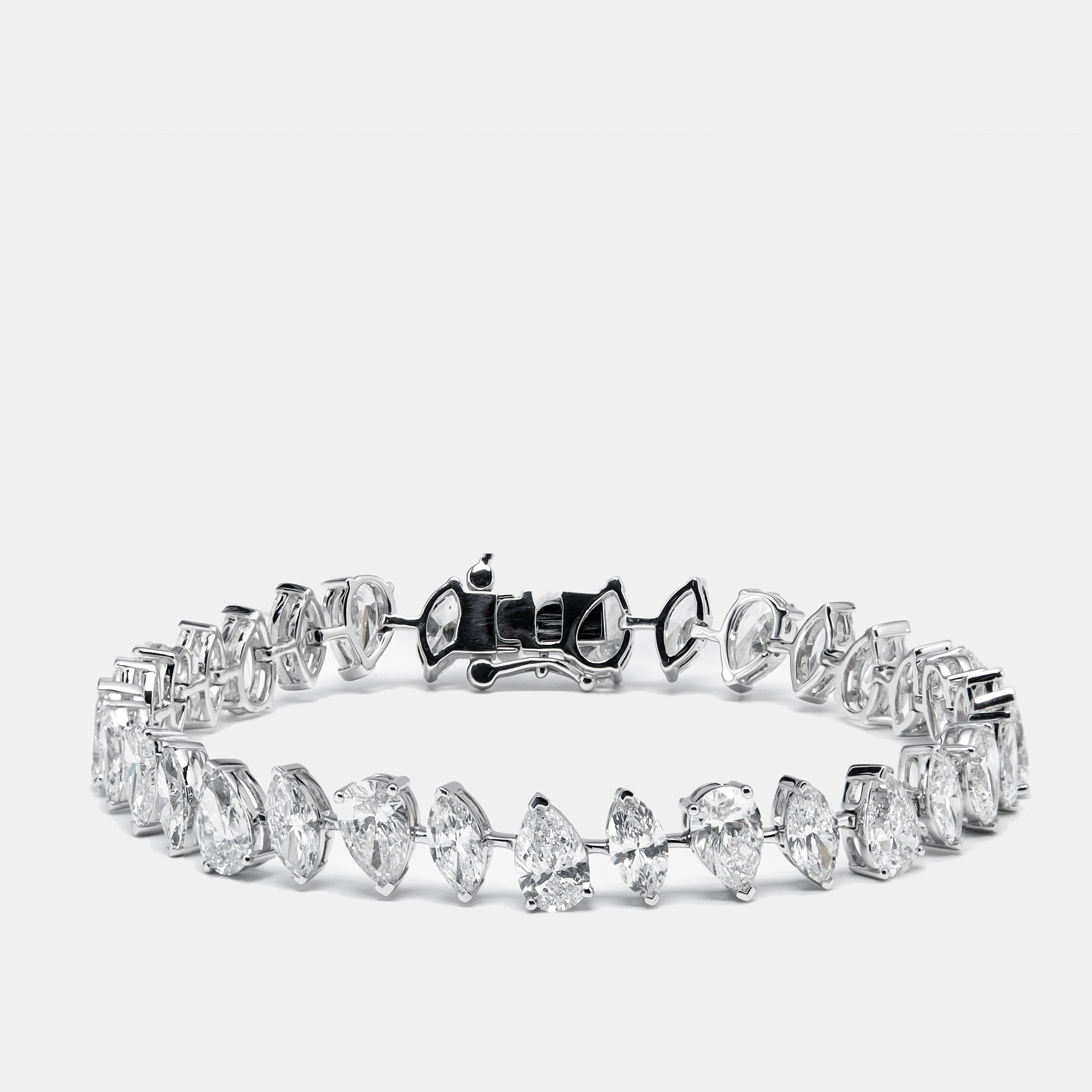 A symphony of cuts, each stone adding its own note of brilliance. Pears, rounds, ovals, and marquises gather in 9.5 carats of light, their varied shapes creating a rhythm that feels spontaneous and alive. Set in 18k white gold, the bracelet glimmers like a constellation, shifting and sparkling with every movement of the wrist.