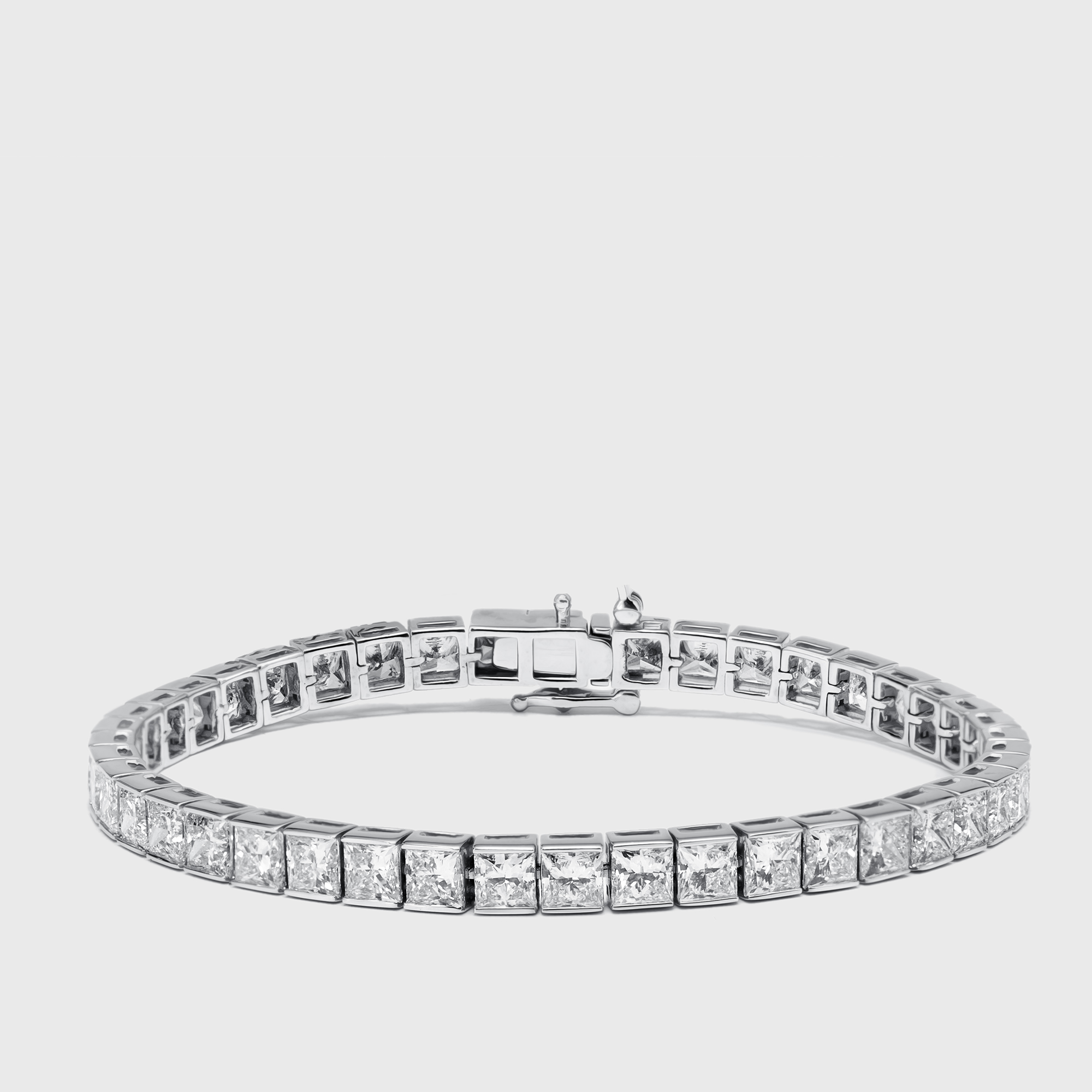 A line of light drawn with perfect precision. Princess cut lab grown diamonds sit edge to edge in white gold, their square facets flashing with clean, crystalline fire. The effect is modern, radiant, and endlessly alluring around the wrist.