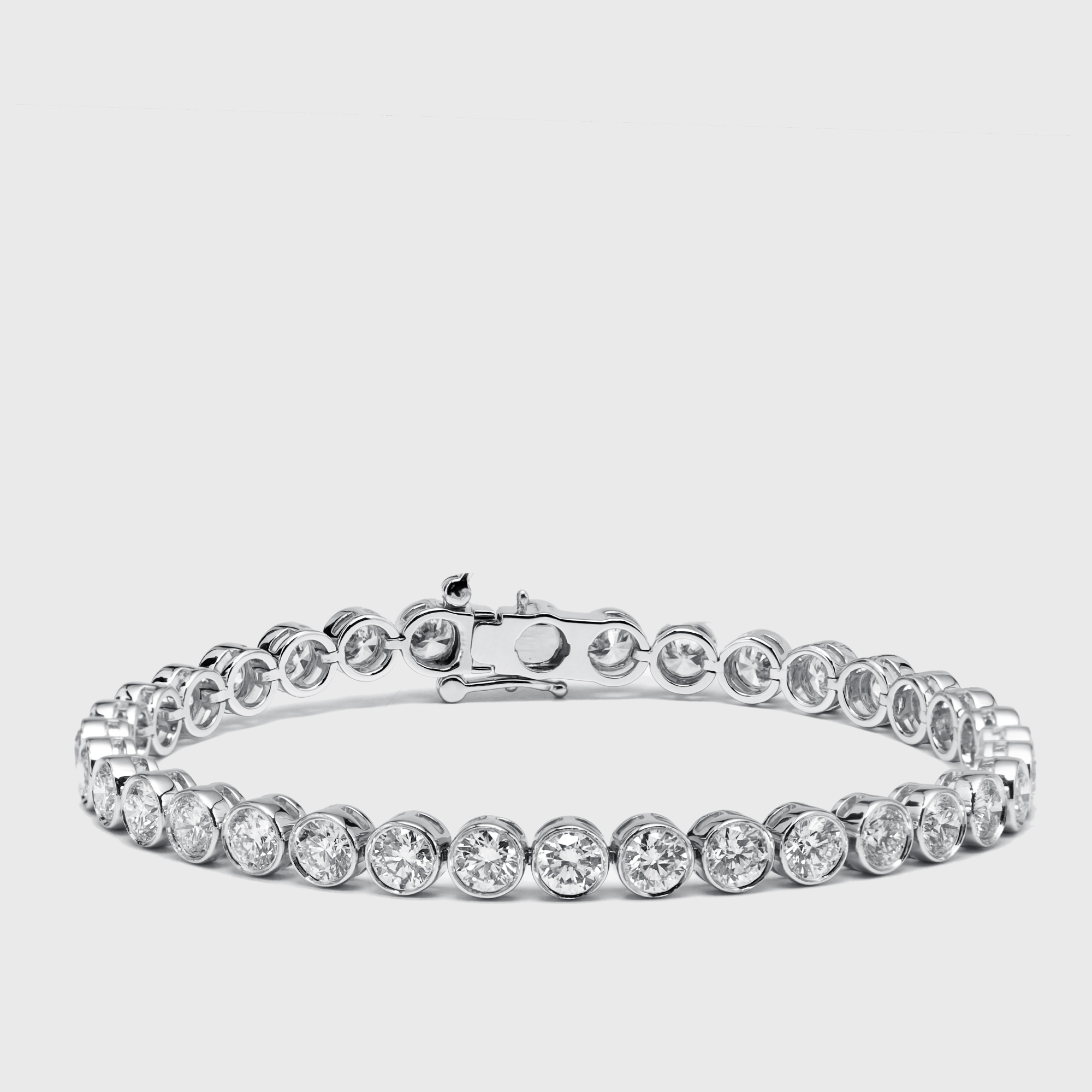 Delicate in scale yet radiant in presence. This bracelet features 4.5 carats of round diamonds that shimmer across white gold like scattered stars at dusk. A refined touch of brilliance for every occasion.