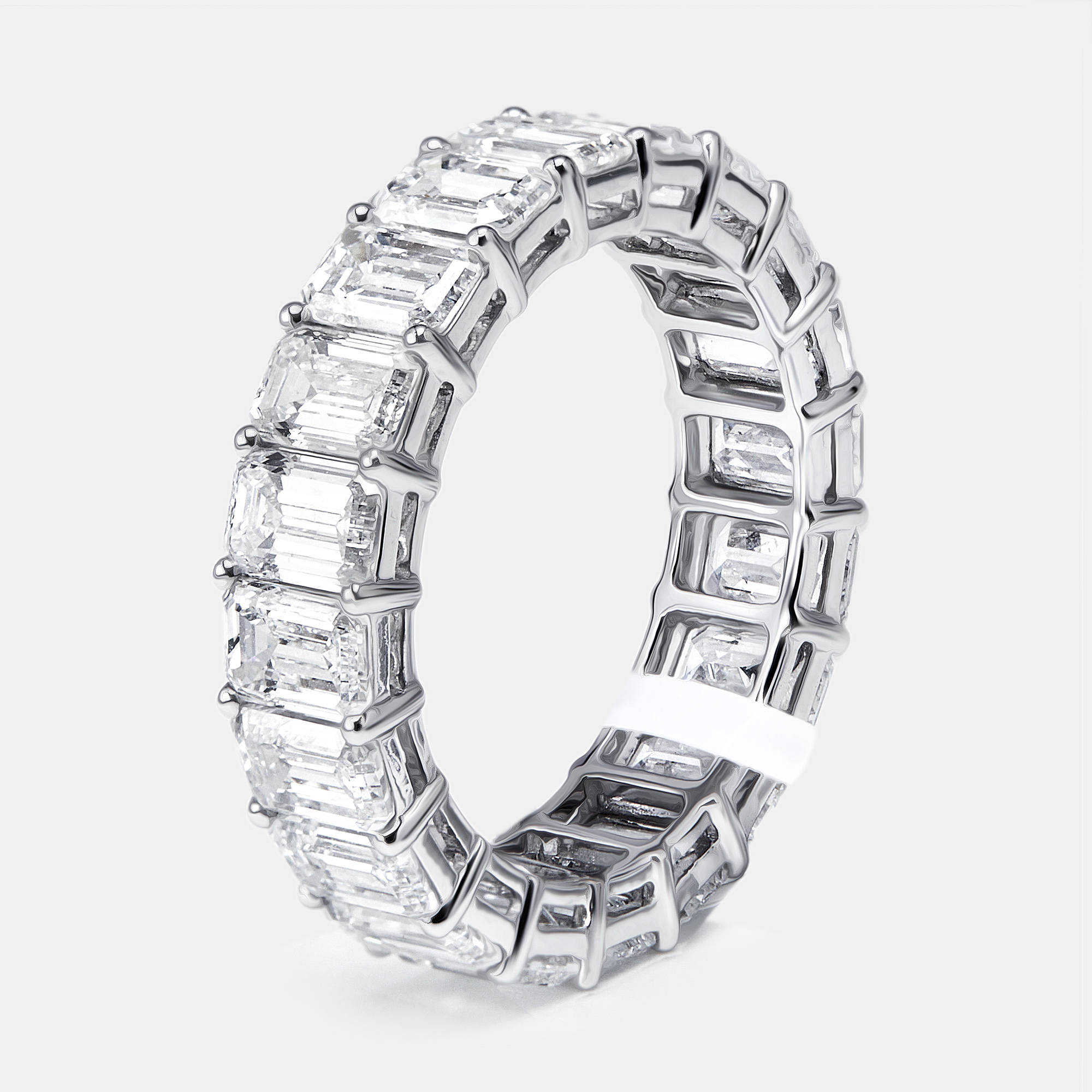 Emerald cut diamonds, 6.5 carats in total, march around the band in flawless rhythm. Each step cut stone reflects light like mirrored glass, giving the ring a kind of beauty thats eternal.