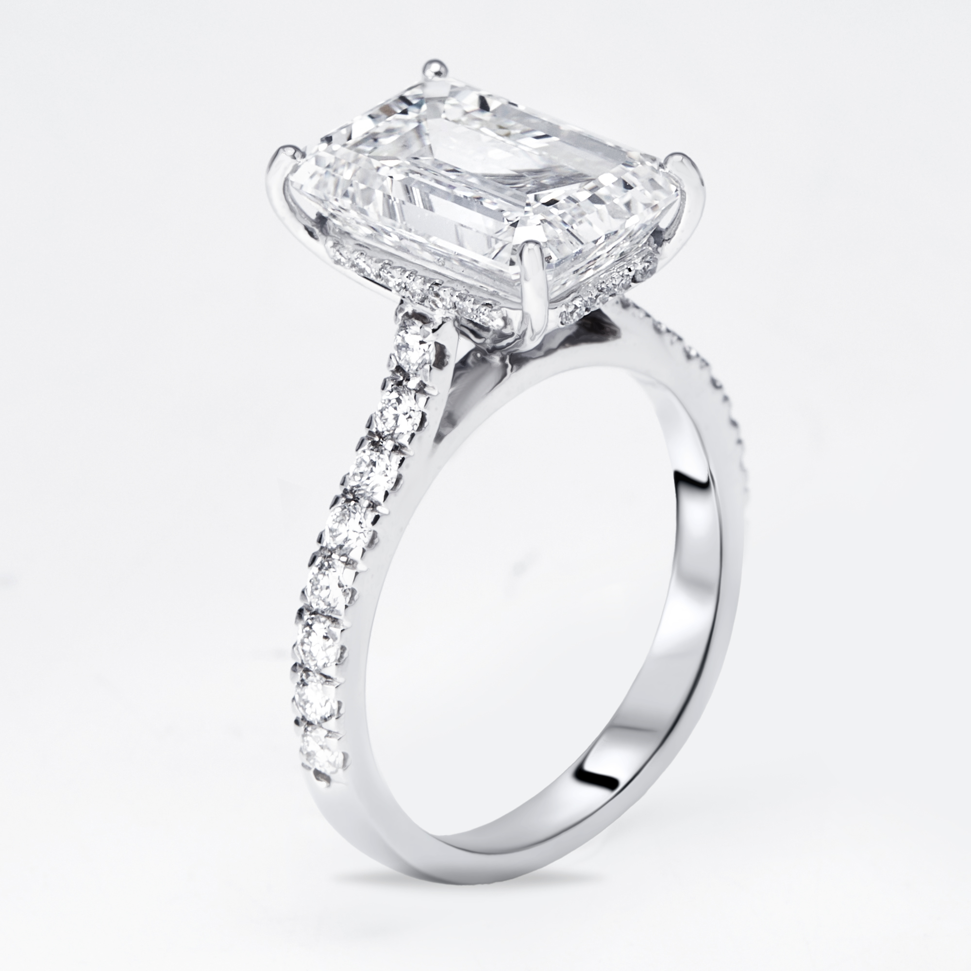 Like the skyline reflected in a glass tower, the emerald cut diamond gleams with sleek clarity, its trapezoid sides widening the view. Altogether 10 carats of diamonds, a ring you could catch yourself admiring in the window of a café on a bright city morning.