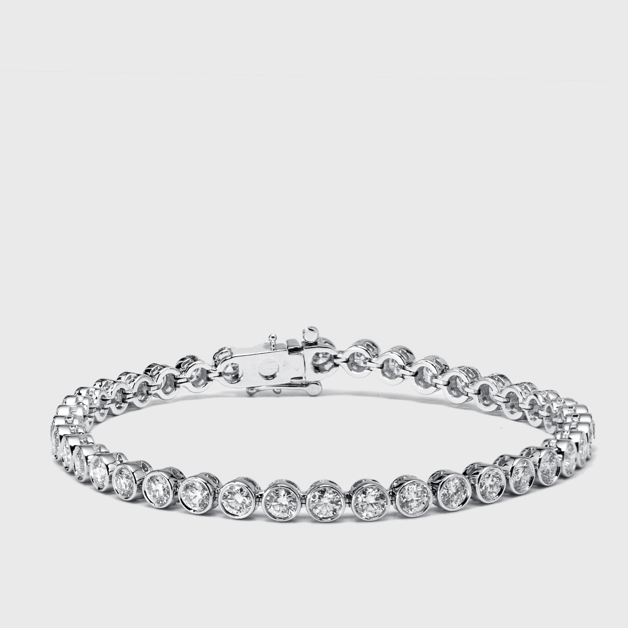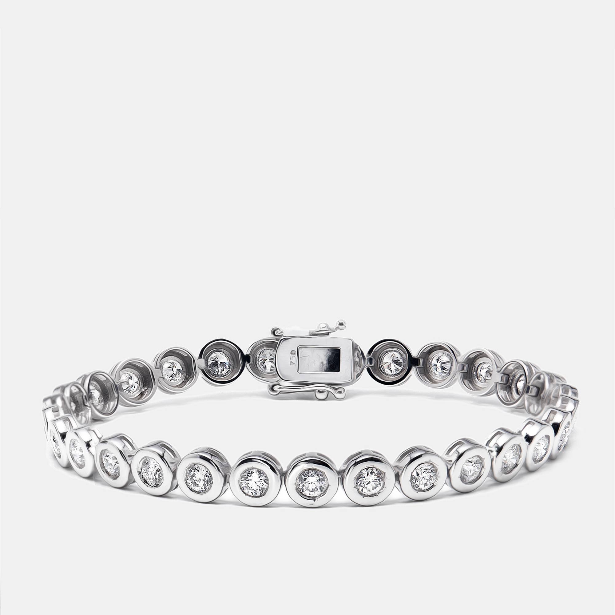 A row of bezel set diamonds rests against the skin, cool and polished, their edges softened by 18k white gold. It’s the bracelet you notice most in still moments, when your hand pauses on a glass or catches the reflection of evening light.