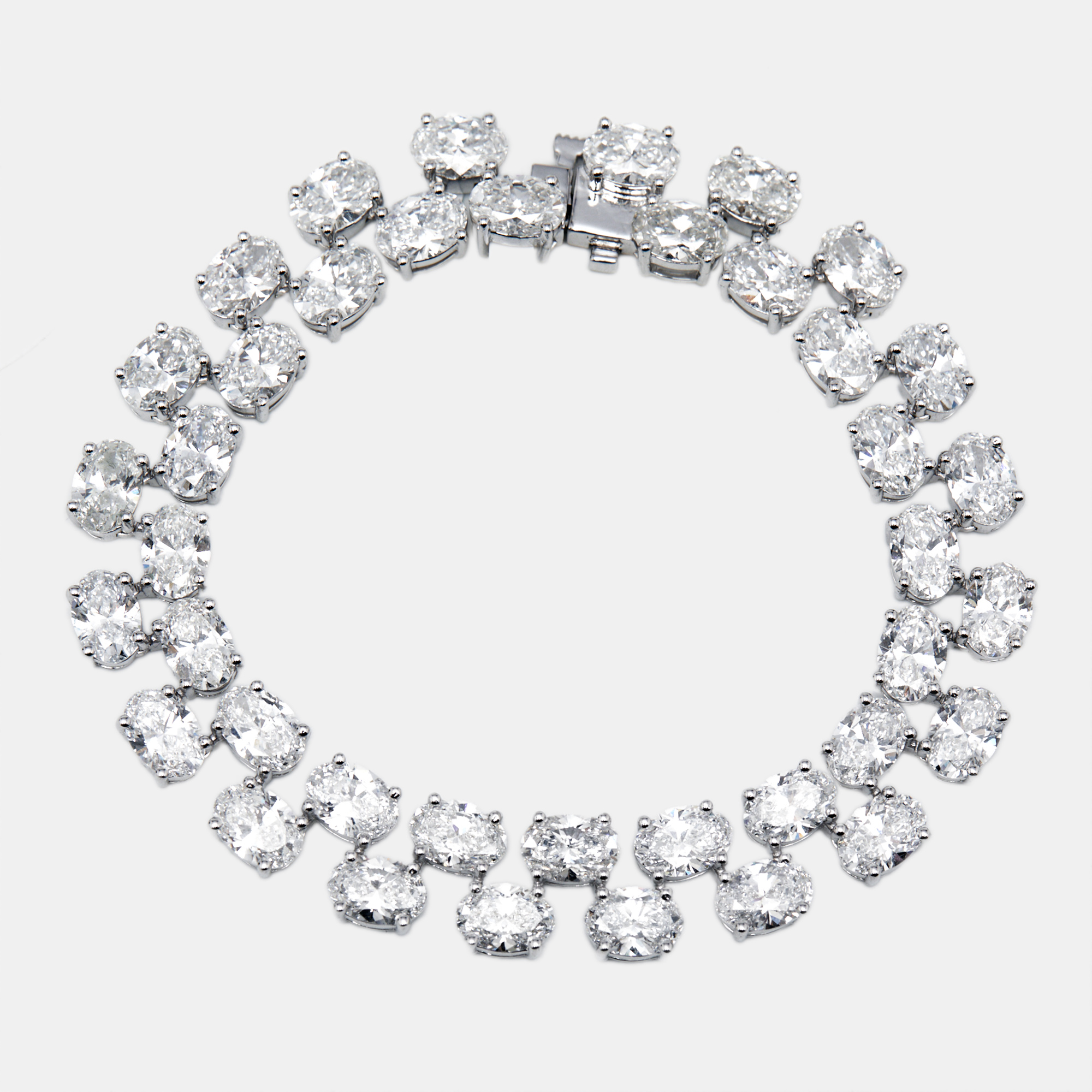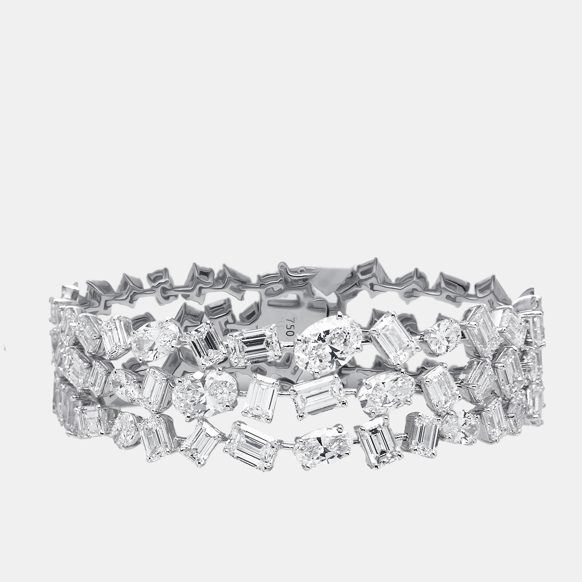 Three rows of emerald cut and oval diamonds form a continuous ribbon of light, each facet alive with brilliance. Together they total 29 carats, their geometry softened by the cool sheen of 18k white gold. The design is refined in structure yet effortless in feel, finished with a simple clasp that lets the diamonds speak for themselves.