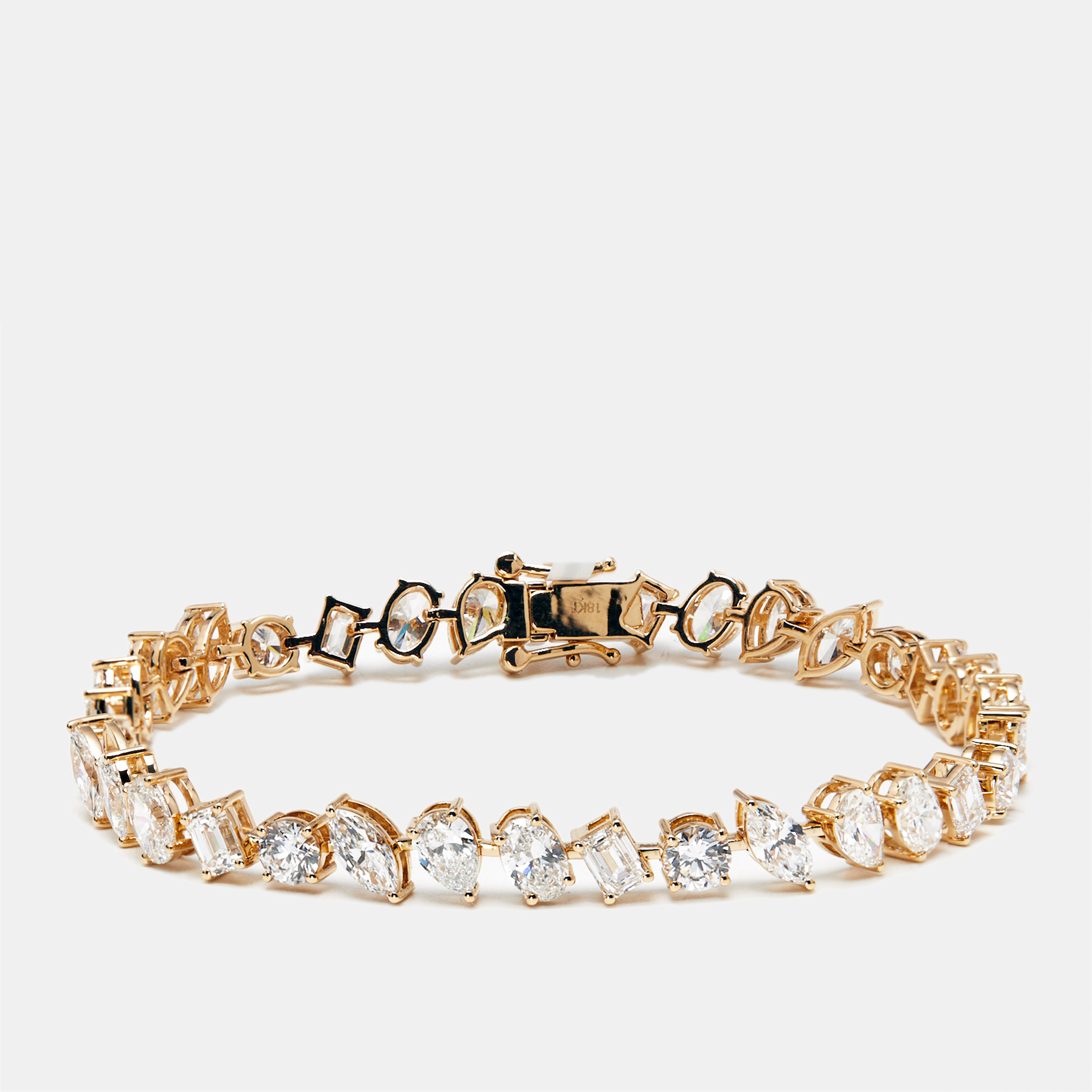 A dance of cuts and light, this bracelet celebrates the beauty of contrast. Pear, oval, emerald, marquise, and round diamonds come together in one harmonious strand, their 11.3 carats shimmering against the warmth of 18k yellow gold. Each stone catches light in its own way, creating a piece that moves as gracefully as the one who wears it.
