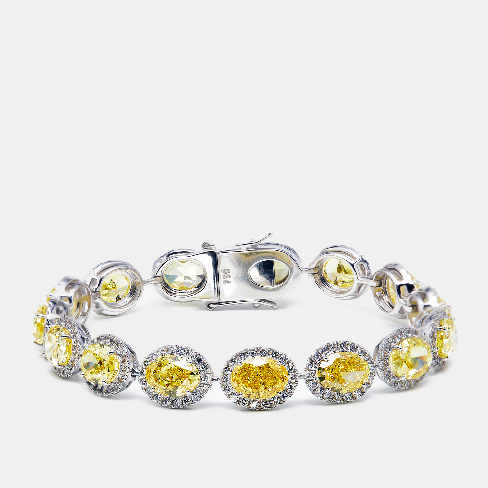 Each vivid yellow oval diamond is framed by a halo of round white stones, their contrast creating a soft, glowing rhythm around the wrist. Set in 18k white gold, the lab grown diamond bracelet for women feels luminous and full of character, like sunlight captured in motion.