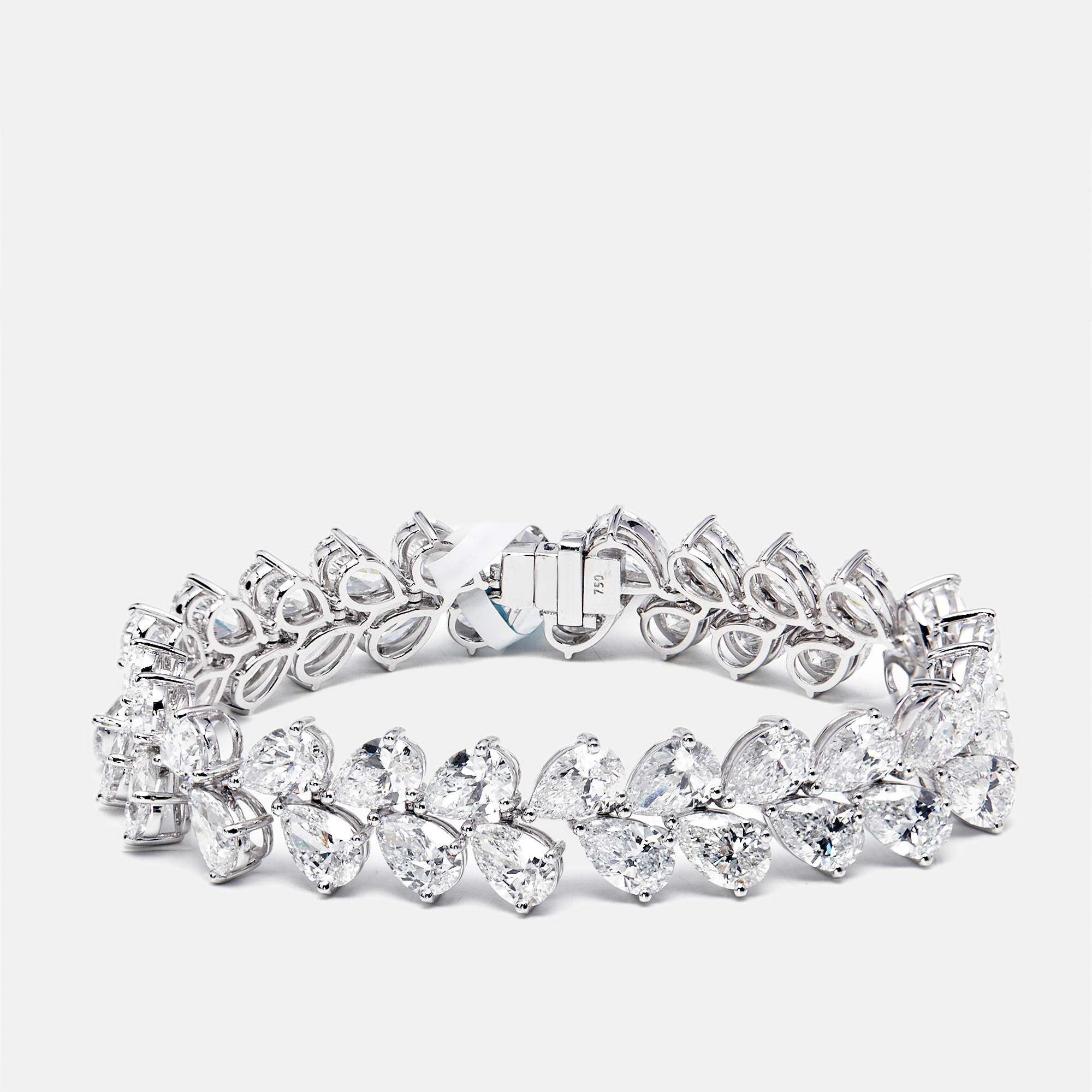 Two rows of pear shaped diamonds flow together to create subtle leaf like shapes in a graceful rhythm. Set in 18k white gold, the bracelets dance of light and form reveals something new with every glance.